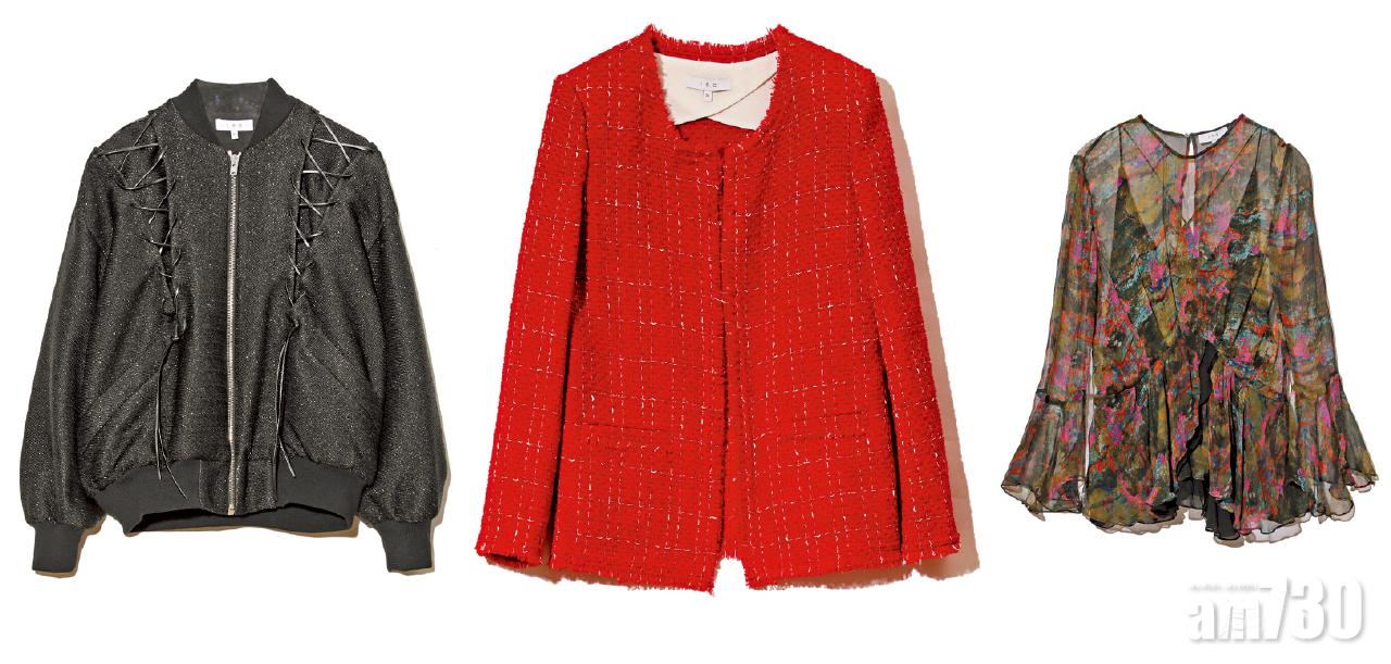 [左至右] 黑色綴銀紗bomber jacket $7,899(B)/紅色tweed jacket $4,399(B)/啡黑色抽象圖案絲綢top $3,699(B)