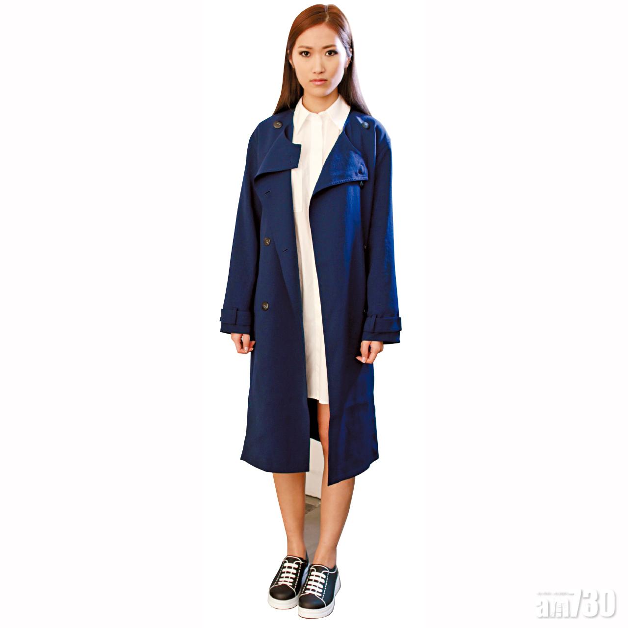 藍色trench coat $6,499(A) 白色shirt dress $2,899(A) 黑色白線圖案sneaker $1,699(F)