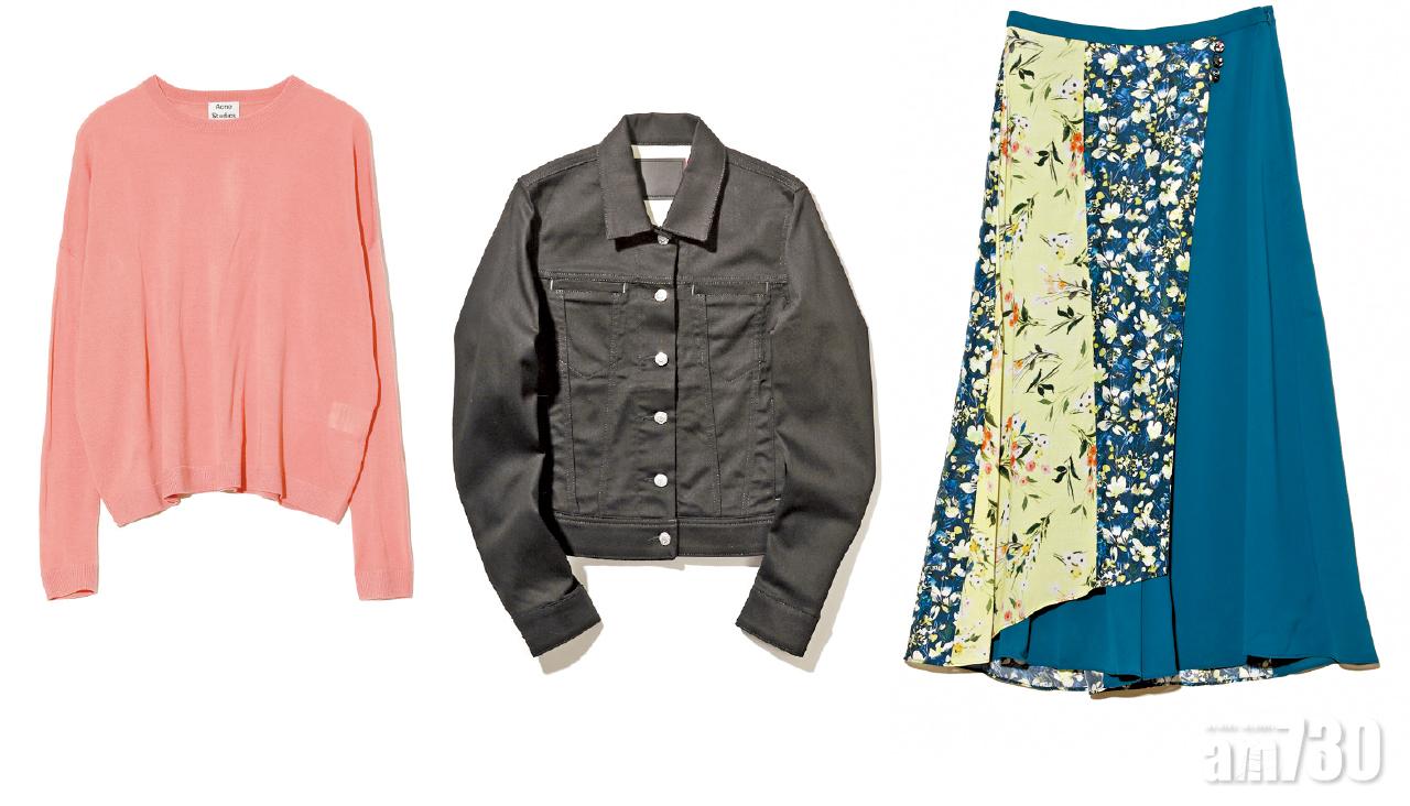[左至右] 粉紅色knit top $2,499(A)/黑色denim jacket $2,999(A)/藍色patchwork floral print maxi skirt $4,199(A)