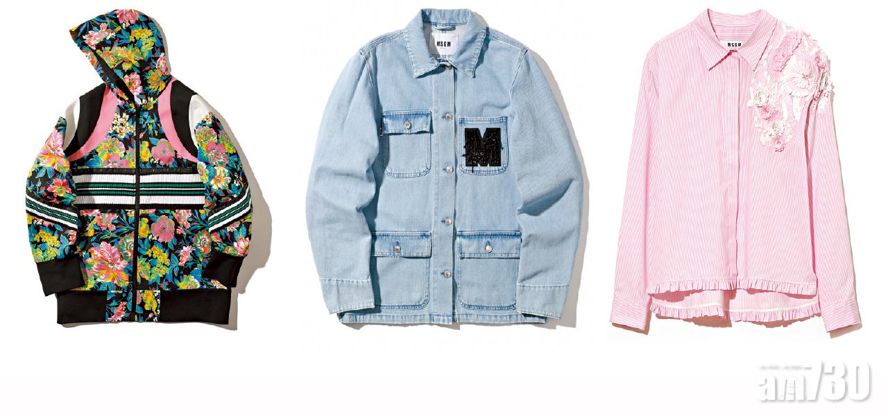 [左至右]  Floral print zip up hoodie $8,999(C)/淺藍色denim worker jacket $3,599(C)/粉紅色條子立體花shirt $6,499(C)
