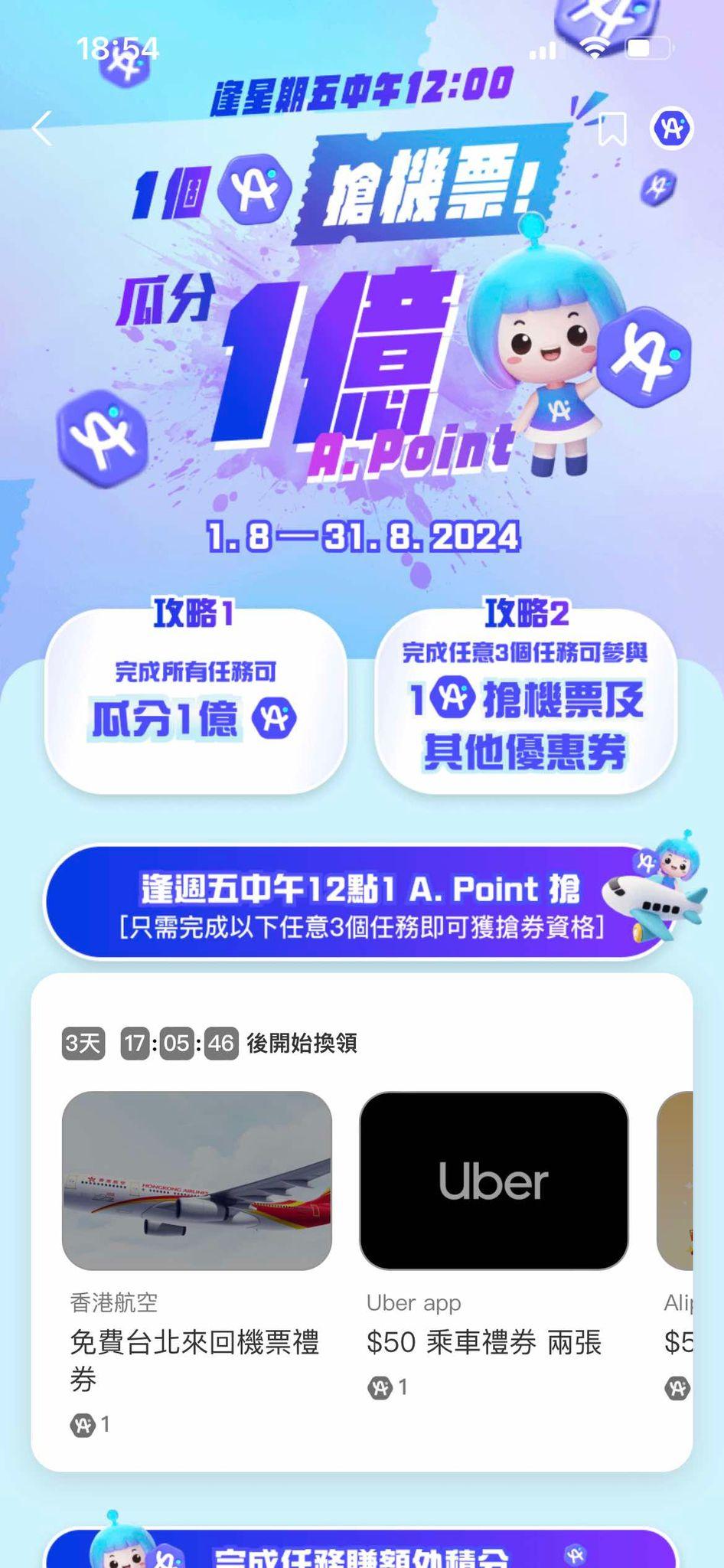 即日起至8月31日,逢星期五中午12時,用戶即可以1個A. Point搶限量香港航空 $0機票禮券!另有多個A. Point即搶優惠包括Uber $50乘車券、$5淘寶券、$5拼多多券,活動期間完成指定任務更可瓜分高達1億 A. Point積分,消費當錢使。