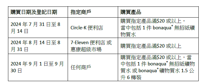 即日起至8月13日期間,在7-Eleven便利店、惠康超級市場購買bonaqua礦物質水產品滿20元以上的成功登記單據,除了「簡生活」大抽獎之外,更會自動參與「隨時加賞」抽獎活動,無須另行登記。