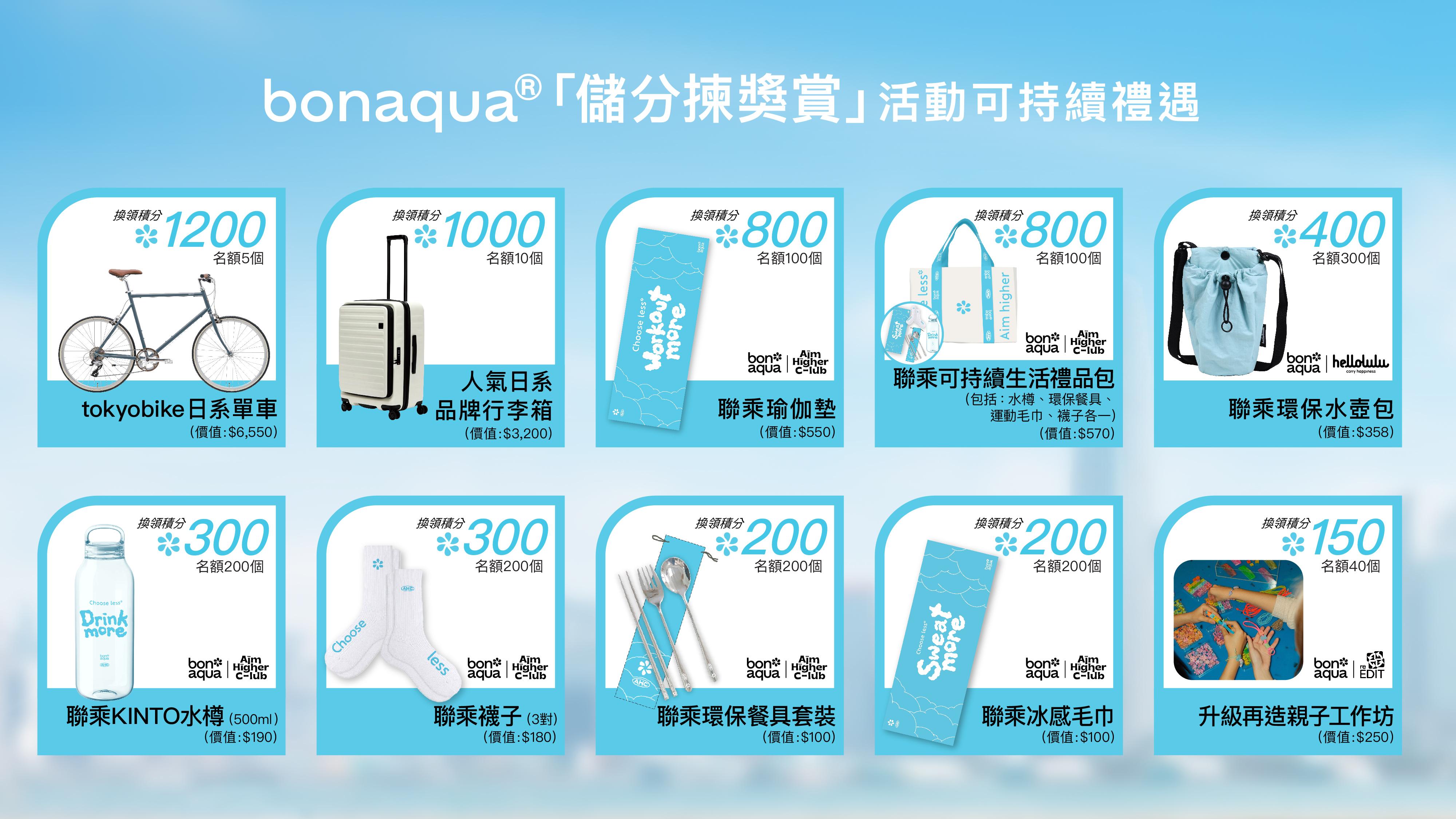 每張成功在 COKE + 平台登記的「簡生活」大抽獎的收據,亦會自動參與「簡生活‧揀獎賞」儲分計劃,毋須另行登記,COKE+ 用戶亦可透過實踐簡約生活累積積分,憑指定積分換領一系列精選的簡精品,包括價值$6,550 tokyobike日系單車、價值$3,220 日系品牌行李箱,以及多款 bonaqua X Aim Higher C-lub 的簡約生活用品,例如瑜伽墊、水樽以及環保餐具等。