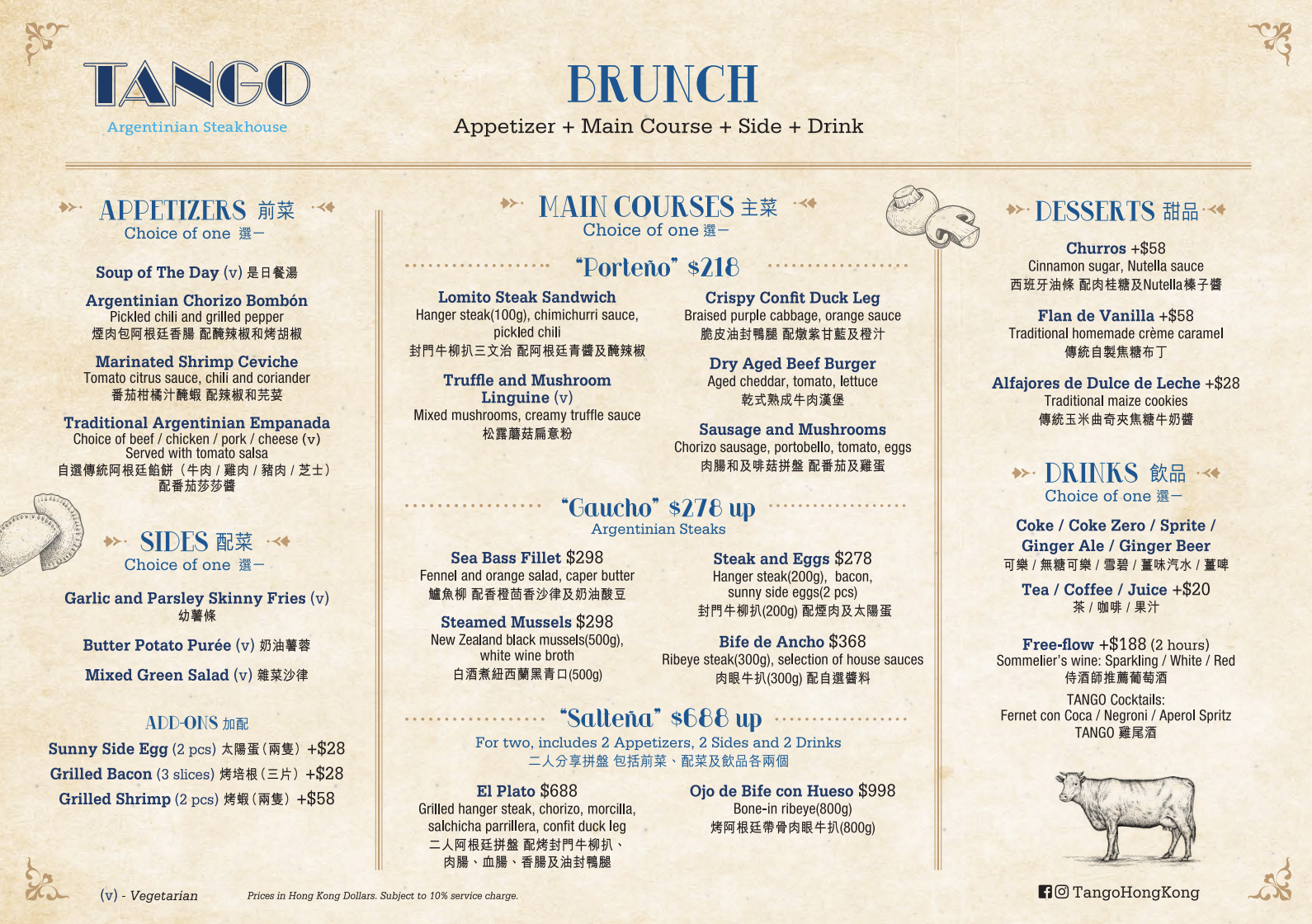 若說起近來大熱扒房,非阿根廷扒房Tango莫屬!Tango現推出週末早午餐及任飲阿根廷葡萄酒,最適合相約朋友一夥人外出聚餐,探索南美盛宴的原始風味。