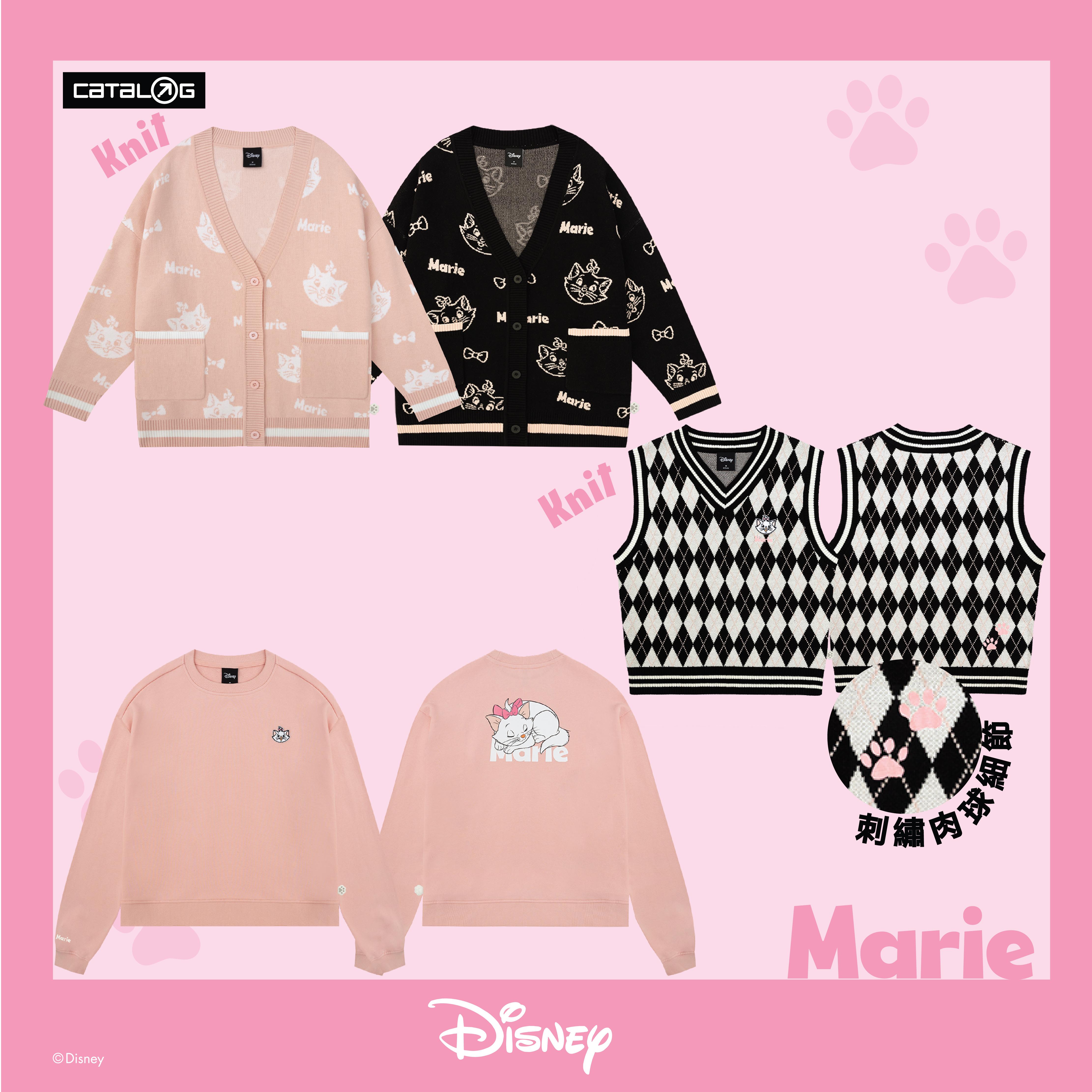 此外還有毛毛質地的外套,帽子設計靈感來自Marie的頭飾,並配有可愛的貓咪肉球口袋,背面同樣刺繡著Marie的大頭圖案。針織外套則提供粉紅和黑色選擇,印有多個Marie的大頭圖案,並設有雙直立口袋。針織背心則以格子設計,心口呈現Marie圖案,背面還有貓爪印的小細節。