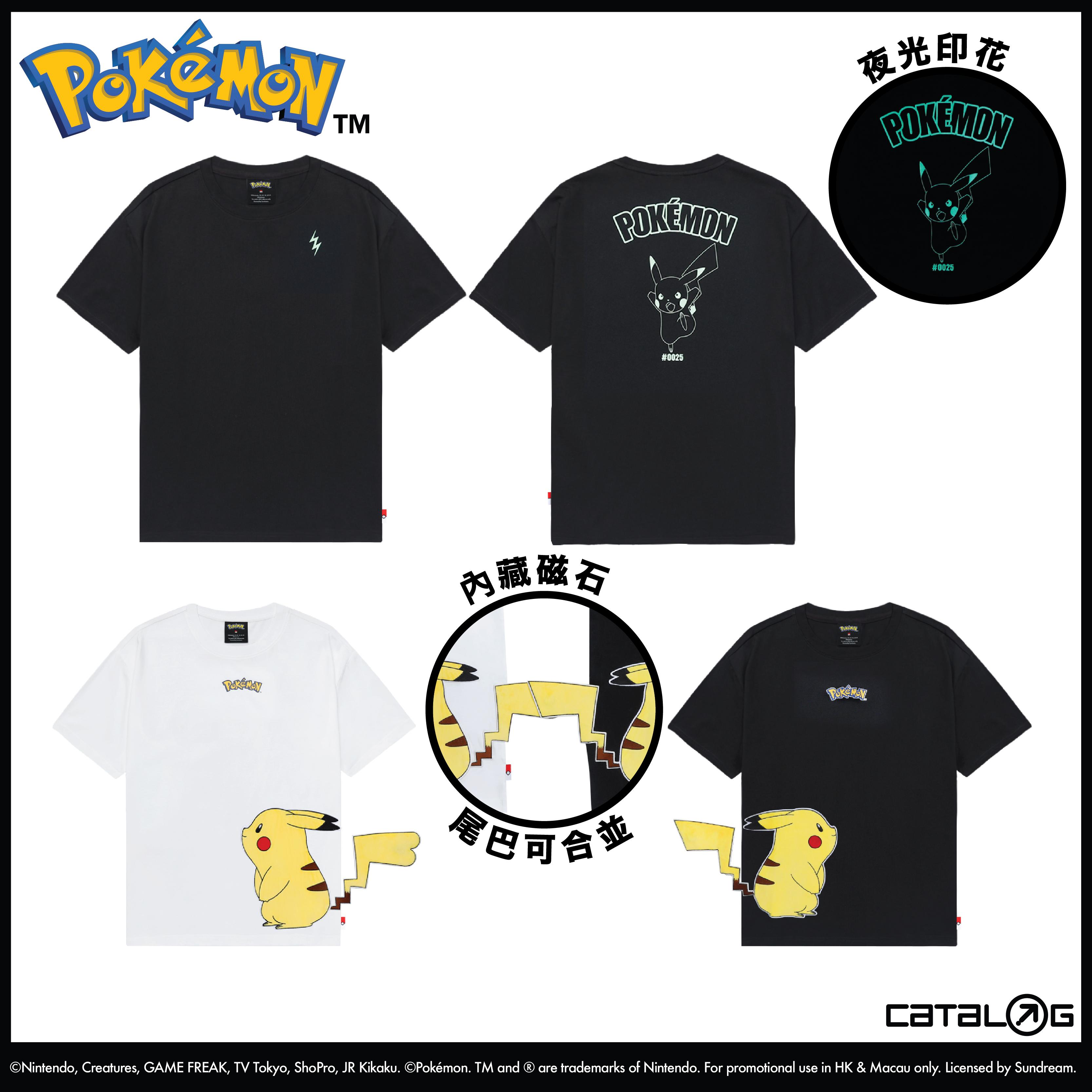 Pokémon 再度登陸 Catalog 第二彈系列主打各種設計印花 Tee,非常適合日常穿搭。首先特別 為大家介紹的是夜光 Pikachu 作為設計的印花 Tee,胸口位置有一個細細的 Pikachu 圖案,而 背後則有較大的 Pikachu 和 Pokémon 字款。這款 Tee 在光線暗淡的環境下特別引人注目。