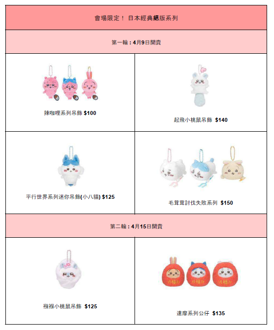 多款CHIIKAWA公仔掛飾,包括經典表情款及限量別注版,將於今次期間限定店再度登場!不少別具收藏價值。21款經典公仔將於4月9日起,分三個階段於會場限量發售,每人每款限購1個,粉絲們絕不容錯過此次機會!