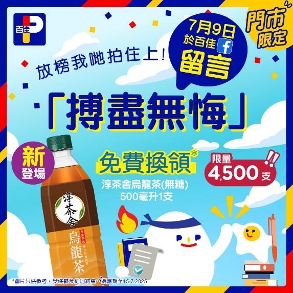 7月9日百佳率先向DSE考生派發淳茶舍烏龍茶(無糖) 500毫升!只需於7月9日當日於指定百佳Facebook post留言「搏盡無悔」即可獲得優惠券免費換領!