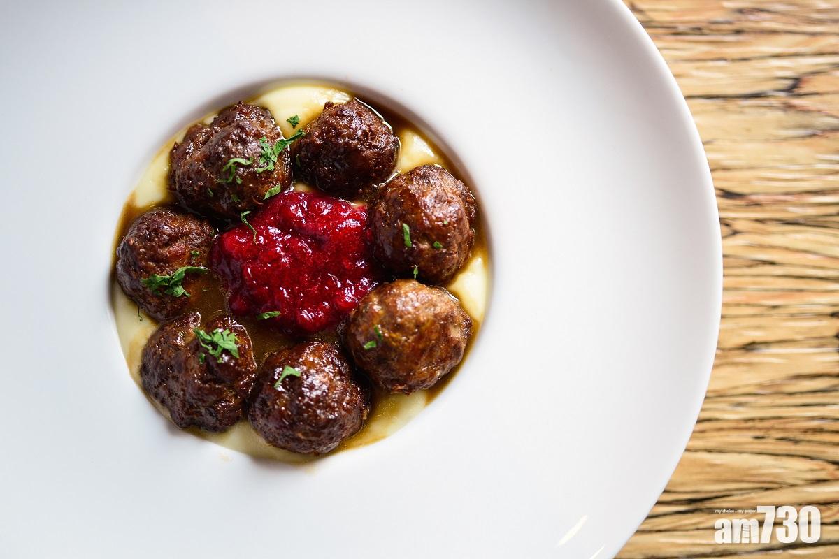 - 招牌主菜自家製芬蘭肉丸 (四粒) 配黃金薯蓉、越橘莓蓉及干邑汁 $80
