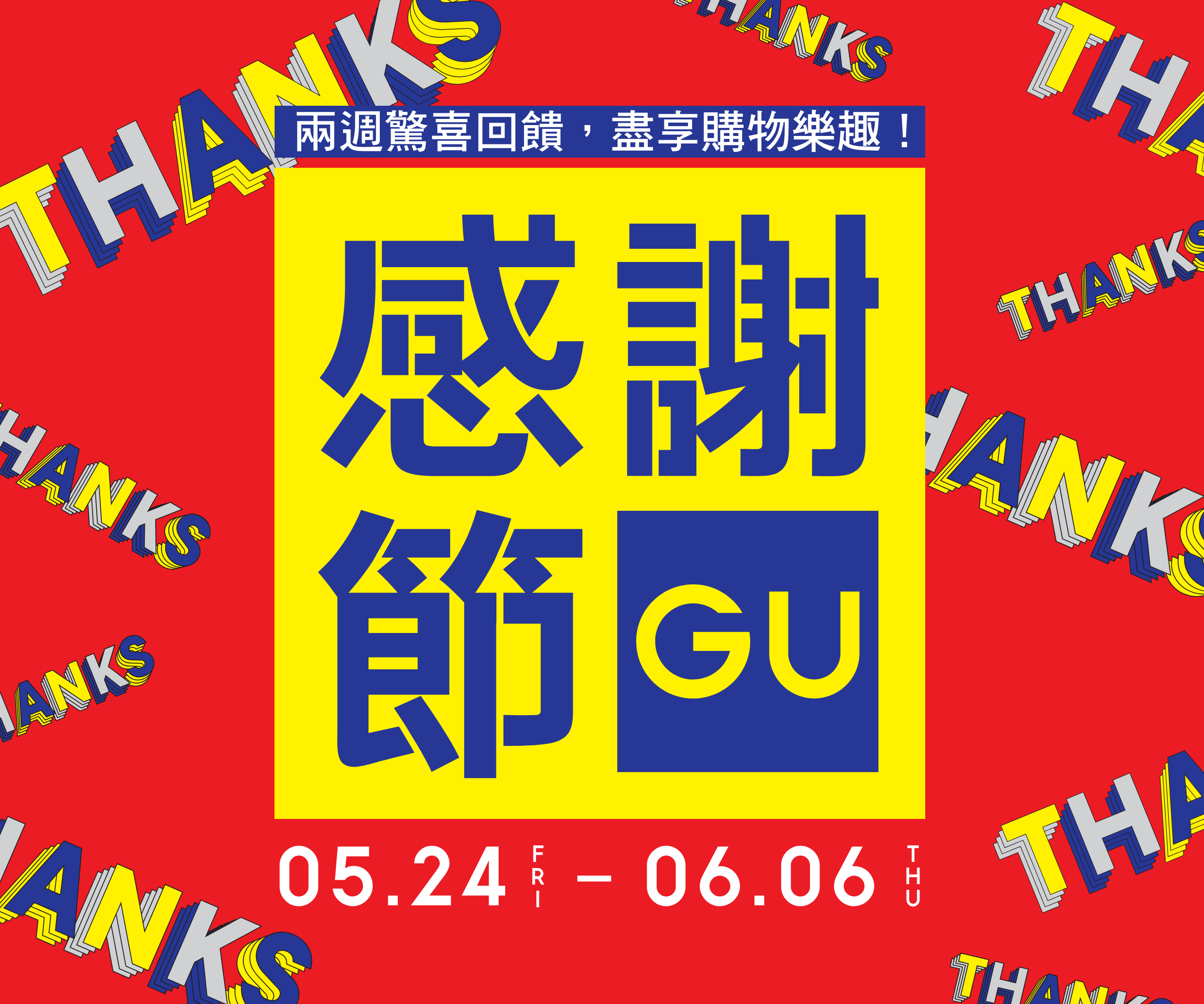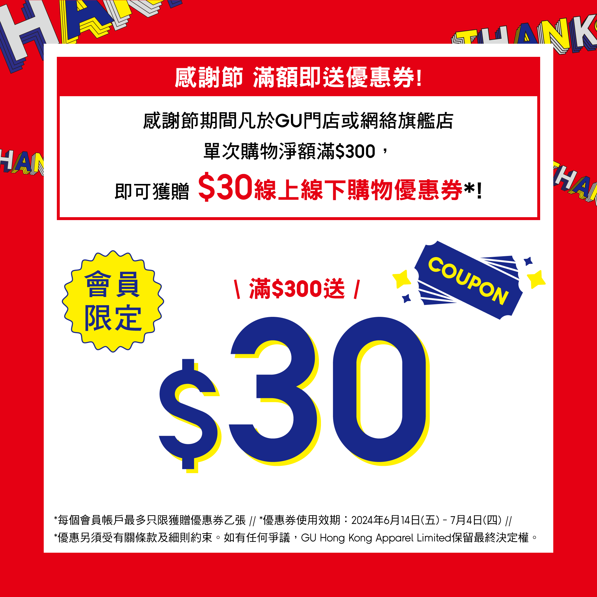 為答謝顧客支持,GU特別推出感謝節會員獨家優惠「$30線上線下優惠券」,於5月24日至6月6日期間,會員凡於門店或網絡旗艦店單次購物淨額滿$300,即可獲贈$30線上線下優惠券乙張。優惠券可於6月14日至7月4日期間使用,可享單次購物淨額滿$300全單減$30優惠!