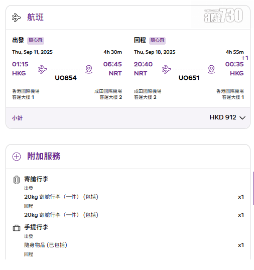 「隨心飛」(包括一件隨身物品及一件20KG寄艙行李)來回票價低至$120,而「無憂飛」(一件隨身物品、一件登機行李、一件32KG寄艙行李及標準座位選擇) 來回票價低至$320。根據記者實測,東京最低來回連稅只需$912起。