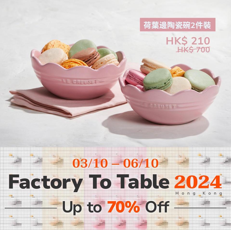 由10月3日至6日期間,Le Creuset將於上環Soho House 舉行Factory to Table特賣會,現場近千款商品優惠低至三折,多買多折,購買兩件商品享額外95折,三件商品即享額外9折!買滿$4,000更可享免費送貨。