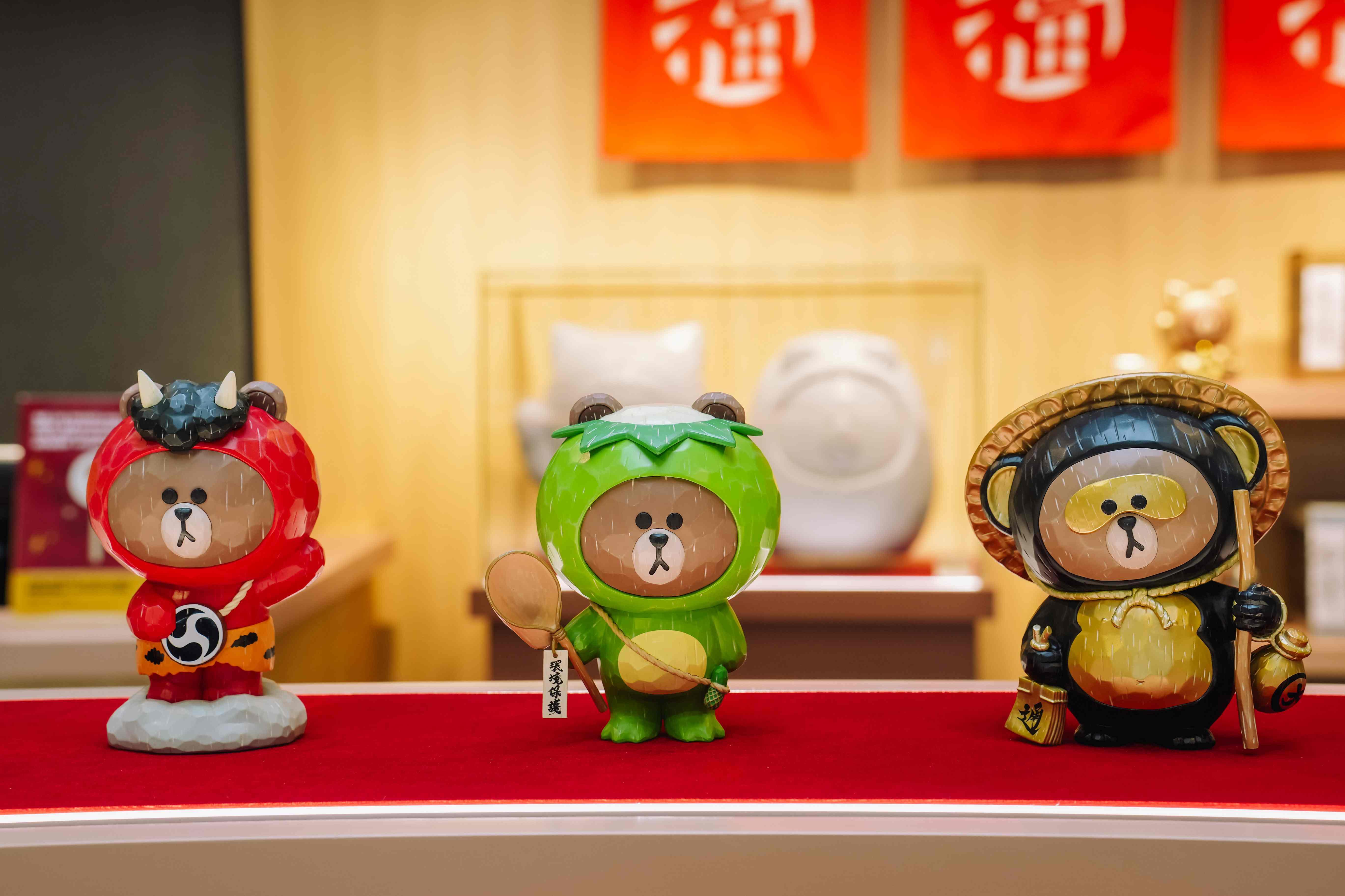 LINE FRIENDS meets URDU福部屋 「河童BROWN」18cm潮玩擺件、LINE FRIENDS meets URDU福部屋「狸貓BROWN」19cm潮玩擺件及LINE FRIENDS meets URDU福部屋「雷神BROWN」21cm潮玩擺件,每款產品設每人限購一個,數量有限,售完即止。