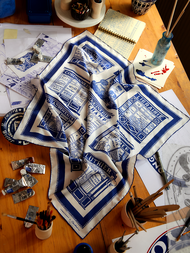 這個標誌以皮革標籤的形式點綴在系列中,如棉質夾克或工裝褲的背面,也印在T恤、LOGO衛衣與新款的Le Pliage手提袋。所有作品採用傳統工作服的厚實棉帆布,藍白配色經過時間打磨,逐漸呈現獨一無二的自然光澤與質感。Riant同時以鈷藍色線條勾畫巴黎的街頭工匠的風貌:從裝修工匠到製琴師,從畫框店到書商,這些典型的店面外觀,成為「巴黎工匠」絲巾的圖案。