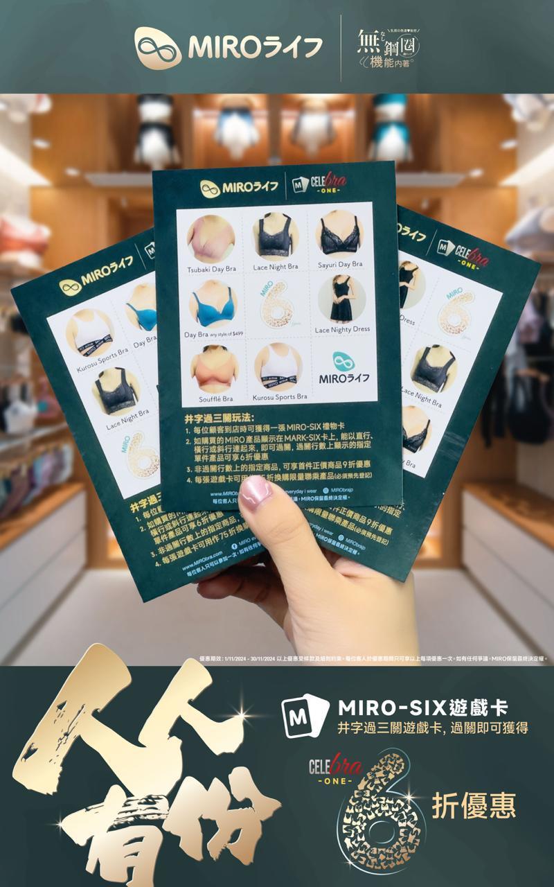 由即日起至1130日,到MIROBra門市即可獲贈「MIRO SIX 遊戲卡」乙張,遊戲玩法以井字過三關形式進行,顧客所購買的產品,於遊戲卡顯示的位置能以直行、橫行或斜行串連起來即屬過關,過關行數上的指定產品任選一件6 折;選購其他商品亦可享首件正價產品 9 折優惠。優惠期內,每位顧客只可享用每項優惠一次。