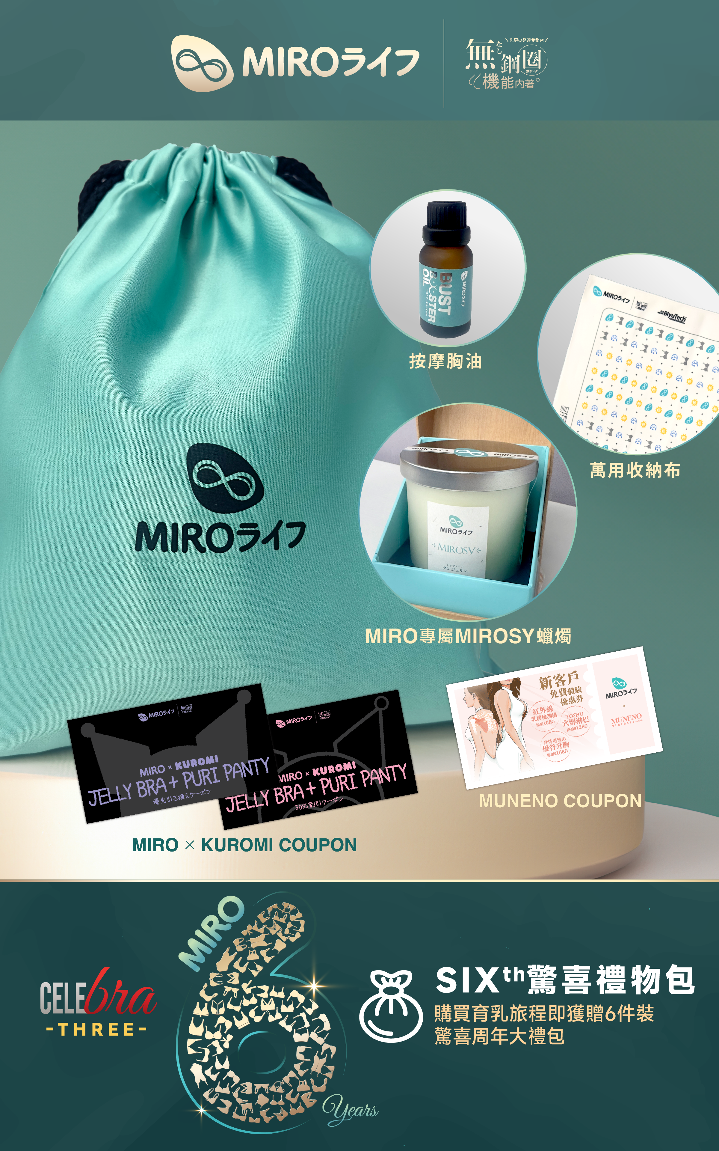 凡購買MIRO育乳旅程的顧客,即可獲贈「6周年六件裝驚喜禮物包」,內含時尚香氛蠟燭、實用收納布及多款育乳折扣禮券,千萬不要錯過!
