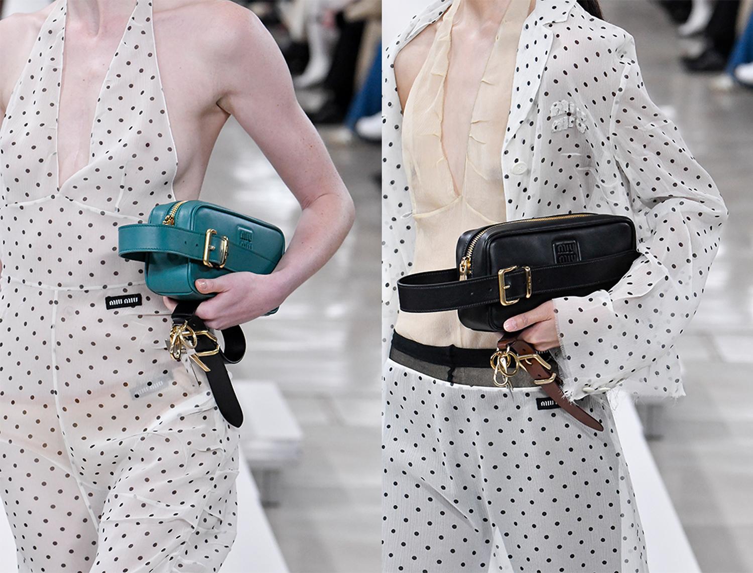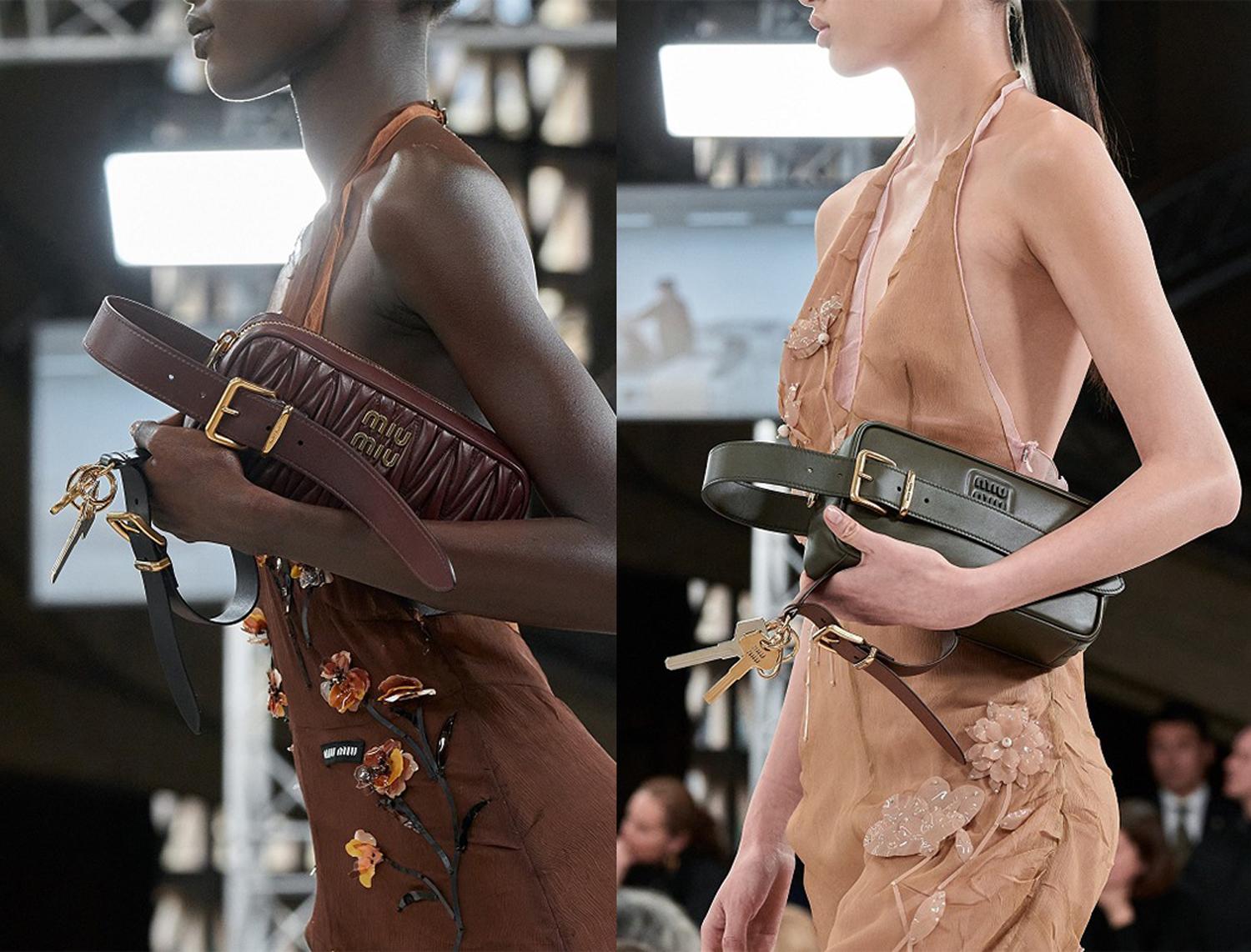 除了服裝方面成為話題之外,手袋迷這次要留意了。每款Miu Miu手袋都好吸引,如長版相機包,設計成Clutch的形態,配上腰帶扣子,線條俐落時尚。還有一個細節飾物,是腰帶加銅匙扣掛飾,流露一種很隨心的時尚感,相信可以成為配飾「黑馬」。