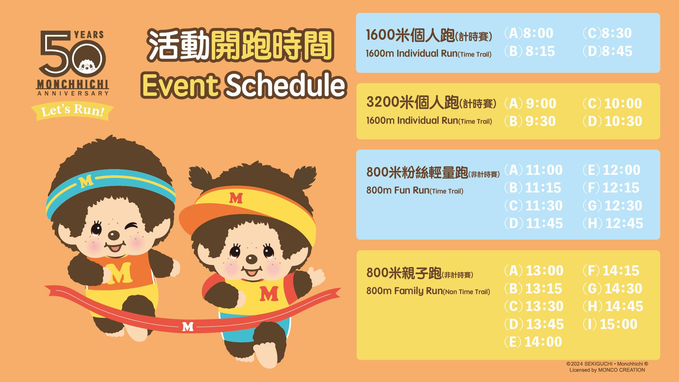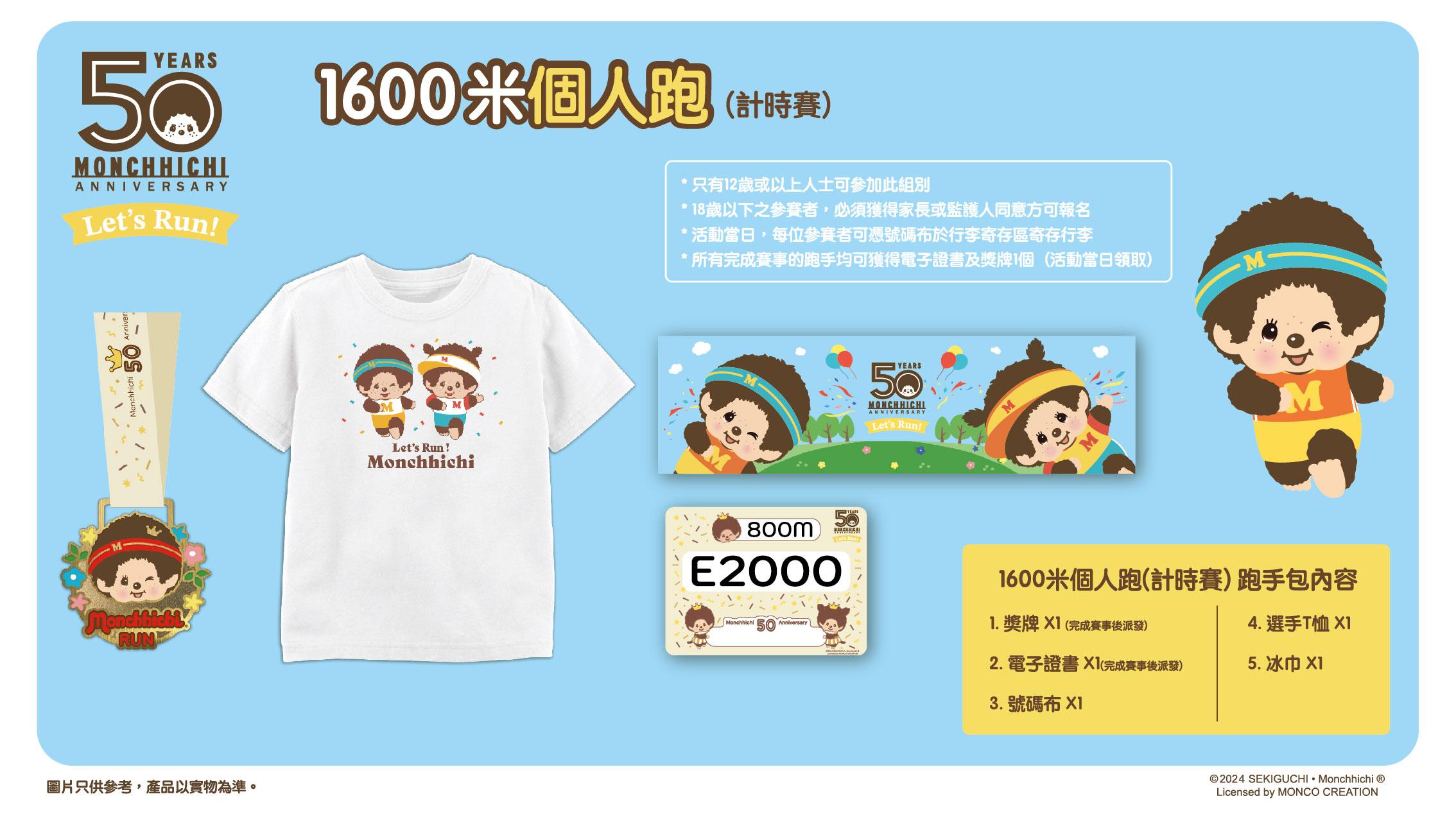 Monchhichi 50週年慶祝跑設有專業跑及FUN RUN兩大環節,共有個人計時跑為1.6及 3.2K、800M粉絲輕量跑及800M親子跑四個項目,適合不同年齡人士參加。活動特設2項Fun Run予個人及親子跑則為初試路跑的朋友及小朋友參加。屆時Monchhichi會換上運動服到場跟參加者打打氣,參加者有機會可以近距離跟Monchhichi拍照及互動,在跑步前後叉叉電。