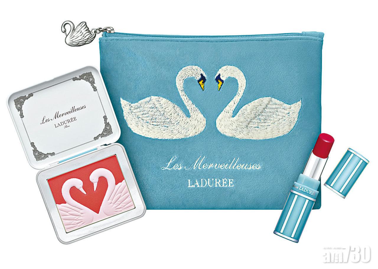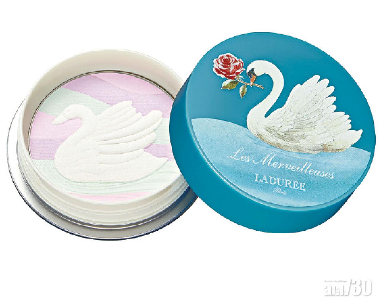 白天鵝彩妝組合 (內附天鵝浮雕胭脂、水光亮彩唇膏及化妝包) $480 (a) 白天鵝光感蜜粉 (蘊含白、粉紅、紫及藍四色珠光粉末) $470 (a) 華麗眼影寶盒