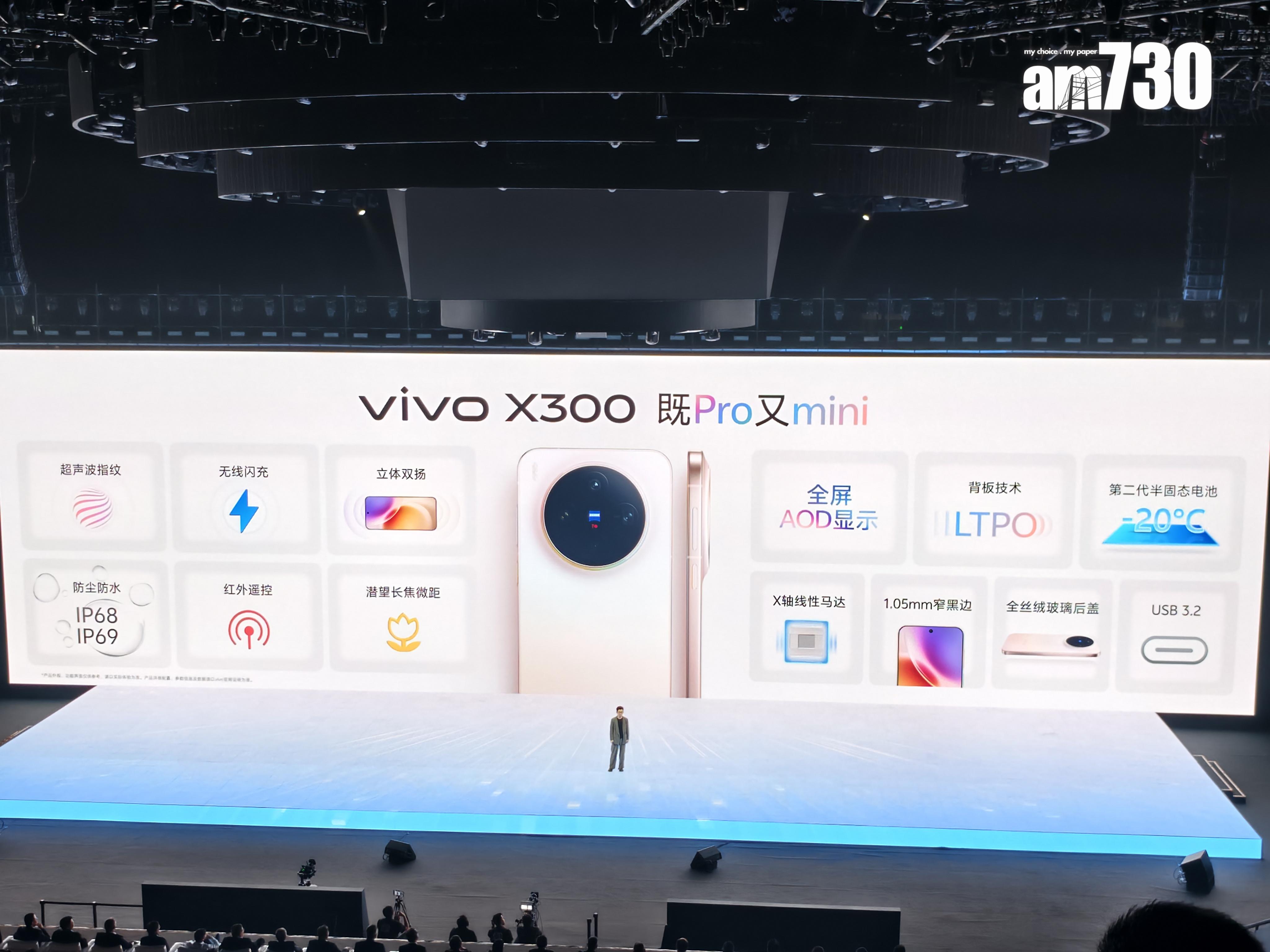 vivo X300為緊湊型手機,厚度7.95mm,配備6.31吋OLED LTPO顯示屏,超窄1.05mm邊框,解像度1.5K及120Hz刷新率,為京東方專屬打造的Q10 plus護眼屏,同時備有2160Hz全亮度高頻PWM調光及DC調光 。內置MediaTek Dimensity 9500晶片,安兔兔跑分突破410萬大關,配備超效能影像NPU專區、自家研發影像晶片V3+及全新V1影像晶片,拍攝性能強勁。