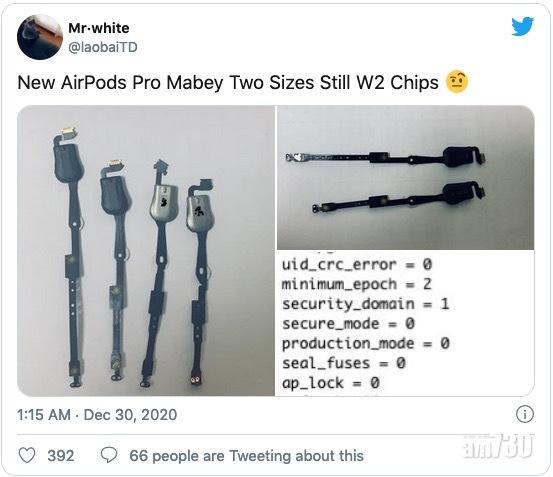 Mr. white在帖文中展示的零件是耳機的微型同軸連接頭,以及Apple自行設計的SiP(System in a Package)單元的照片。由於照片中的同軸連接頭有兩種長度,所以Mr. white估計新一代AirPods Pro很可能會有兩種尺寸。而無線晶片方面,從資料顯示或會採用Apple Watch Series 3所用的W2晶片。