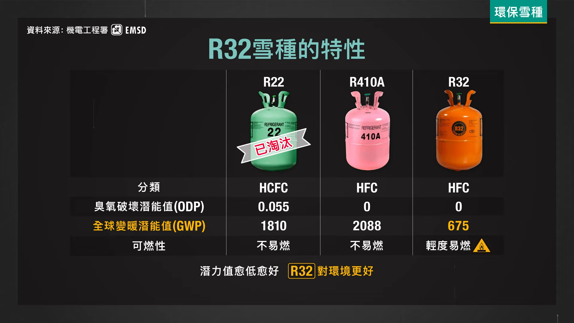 現時冷氣機會採用 R410A 或 R32 雪種,它們不會破壞臭氧層,而兩者的全球變暖潛能值分別是 2088 及 675,分數愈低對全球暖化造成的負面影響愈小,所以潛能值少 3 倍的 R32 雪種對環境自然更好,且其能源效率、製冷能力亦更好。所以選擇冷氣機時,最好找用 R32 雪種的那些款式,不過它有輕度易燃性,所以安裝、檢查時應找專業技術幫忙處理。