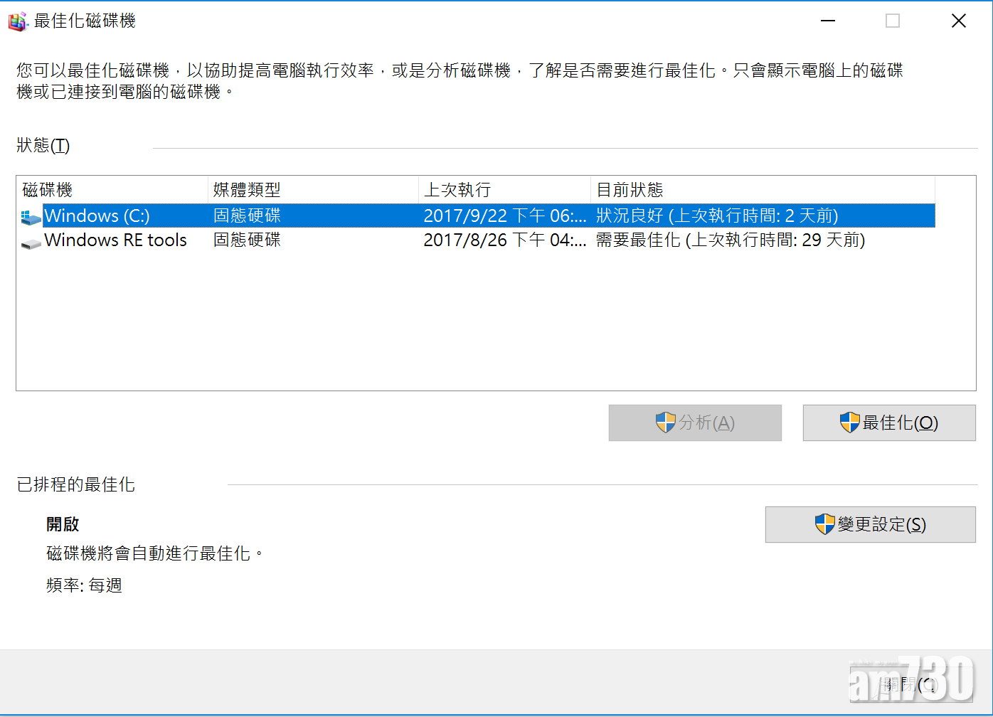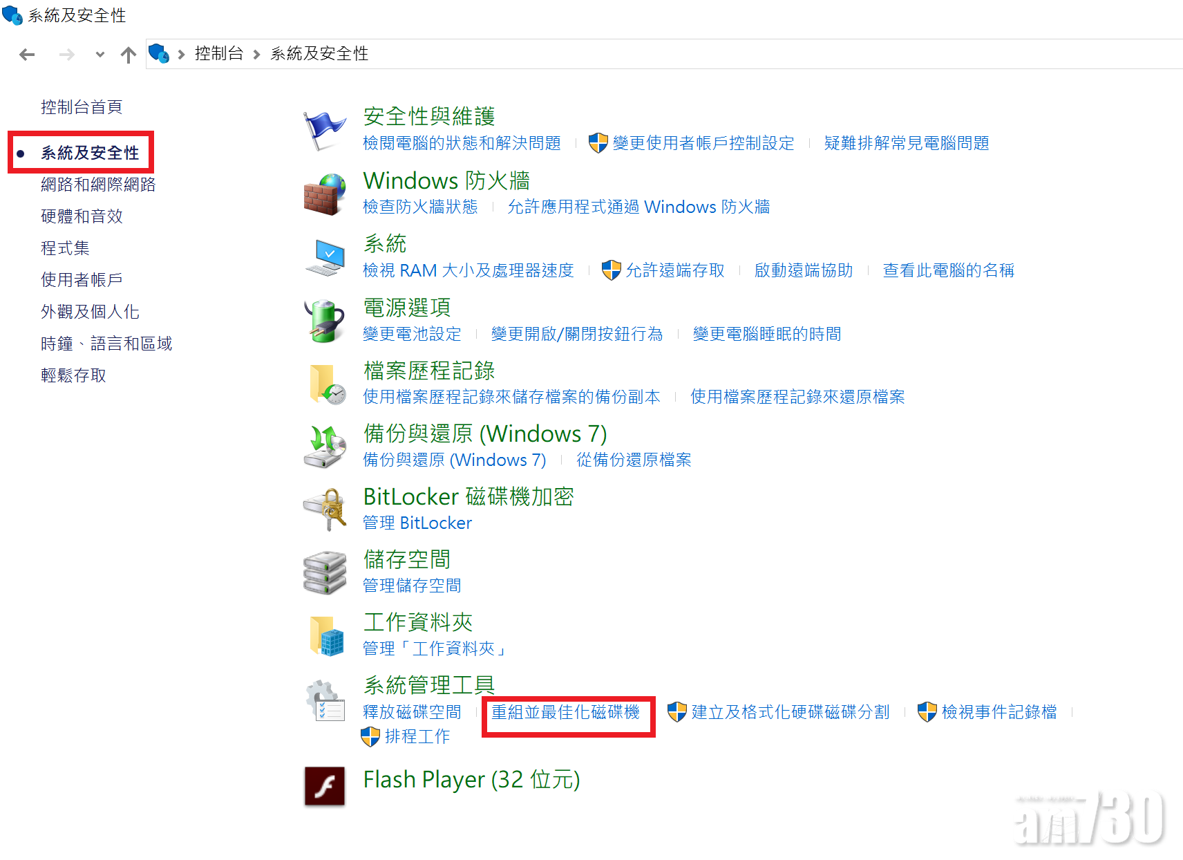 進入「控制台」→「系統及安全性」→「重組並最佳化磁碟機」。