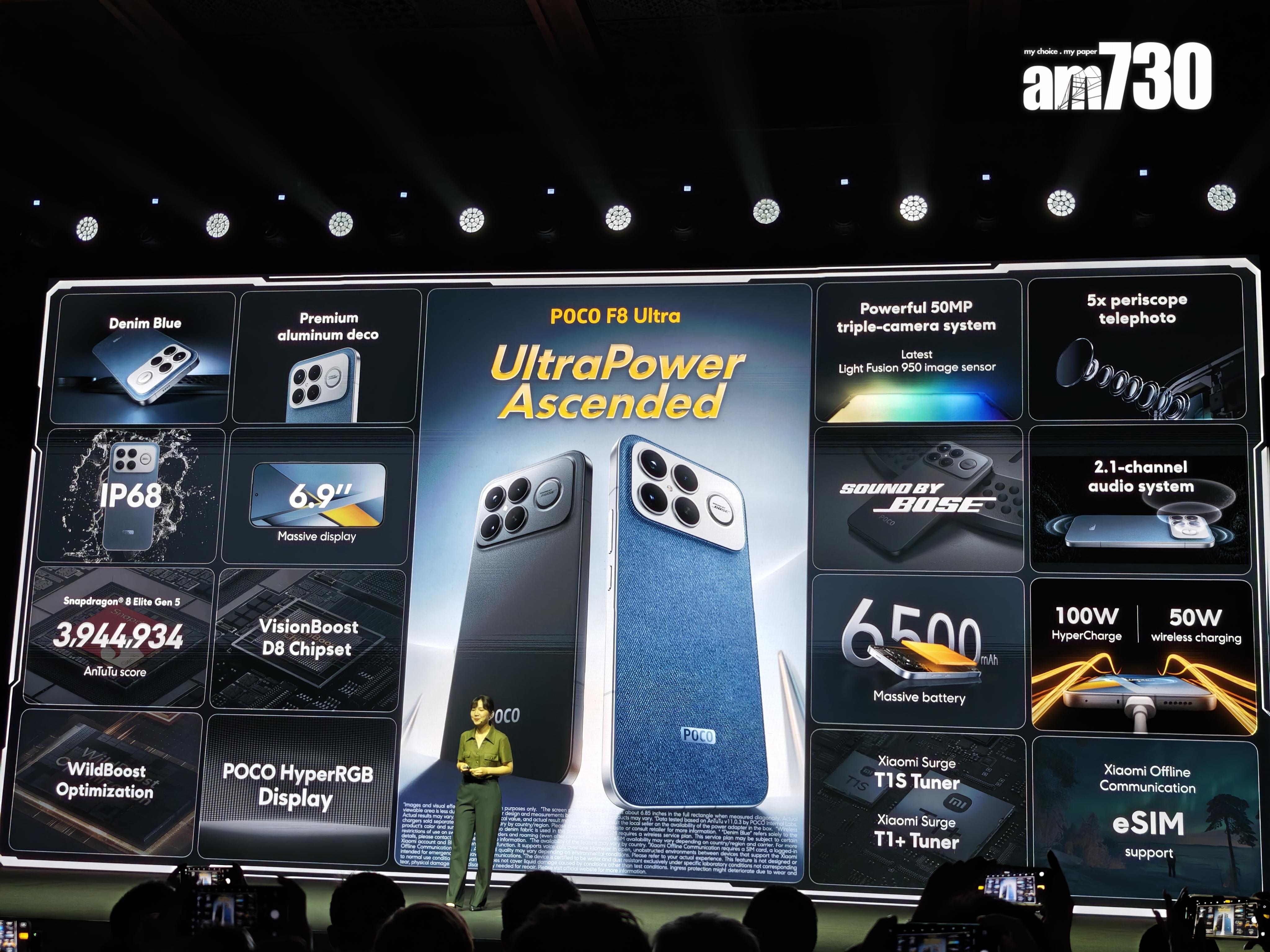 小米POCO F8系列的殺著是以Bose合作的聲學系統。 小米POCO F8 Ultra特設低音喇叭。 小米POCO F8 Ultra搭載3個50MP鏡頭。 小米POCO F8 Ultra影像性能一覽。 小米POCO F8 Ultra的丹寧藍設計極為討好。 小米POCO F8 Ultra電量達6500mAh。 小米POCO F8 Ultra配置一覽。 小米POCO F8 Ultra海外版售價。