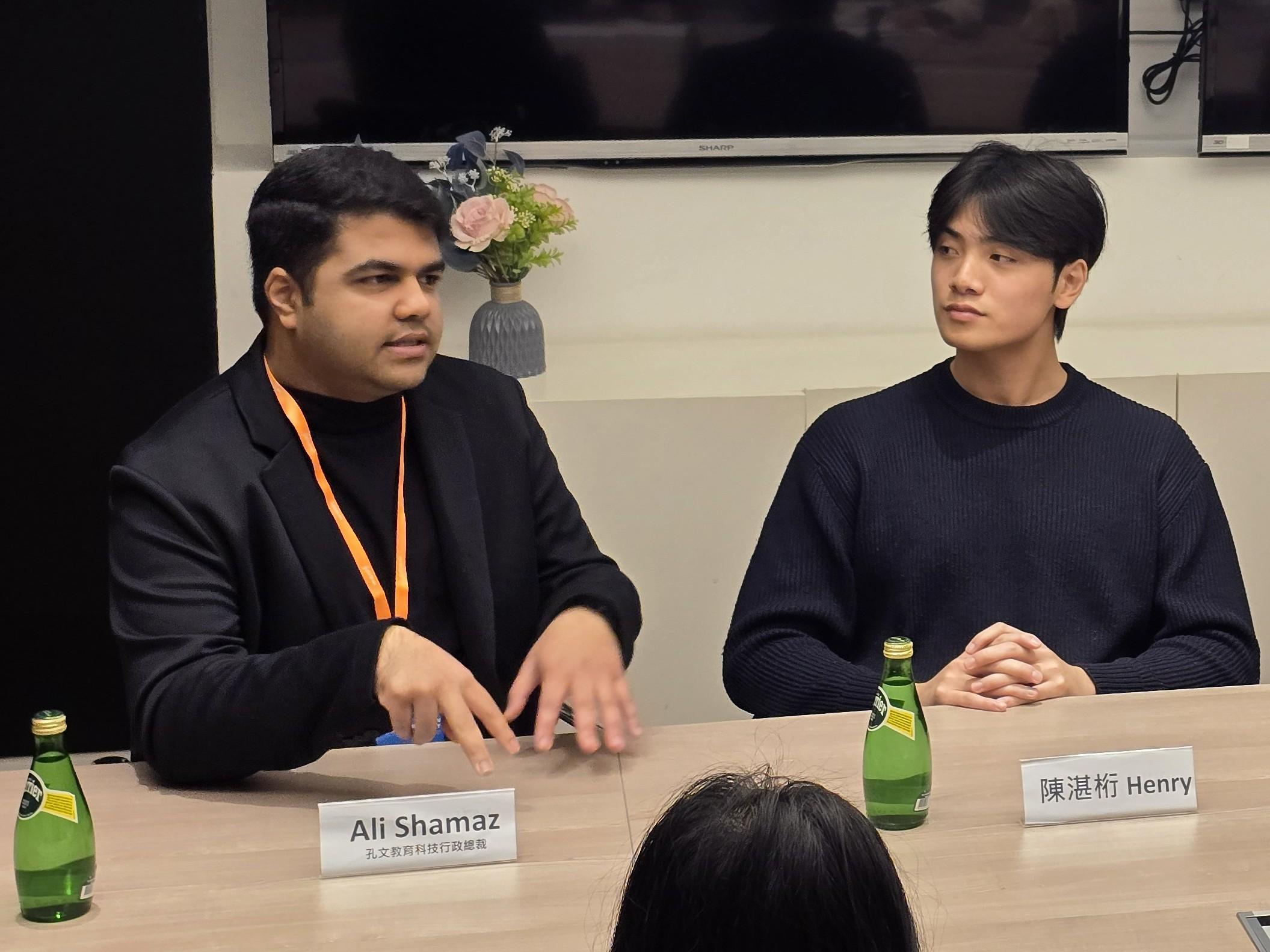 園區初創孔文教育科技行政總裁Ali Shamaz(左)和實習生 - 修讀港大計算機科學2年級的陳湛桁Henry,從勞僱雙方分享職場實戰經驗。