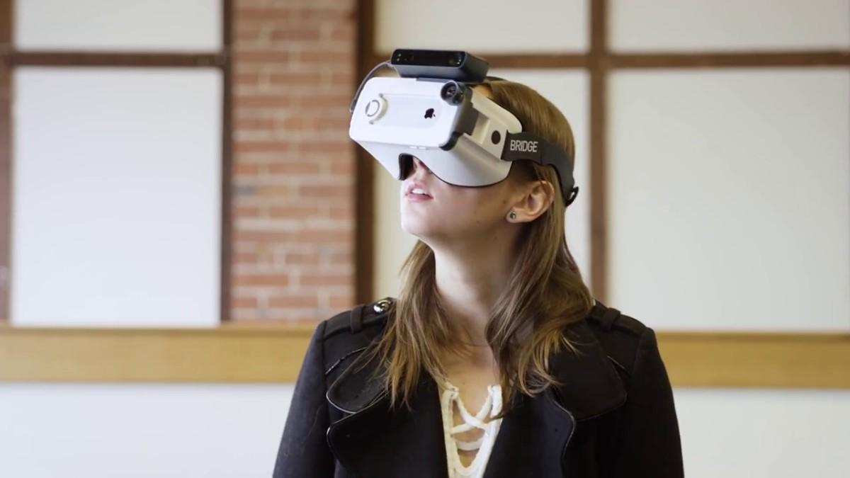 這個由Occipital開發的裝置名為「Bridge」,是一款iPhone專用的虛擬實境裝置,特別之處在於可配合一組名為「Structure Sensor」的鏡頭,能夠掃瞄現實環境並製成3D模型。「Bridge」收集現實環境的3D資訊後,便可以把不同虛擬物件融入環境裡,例如新傢俱擺設。