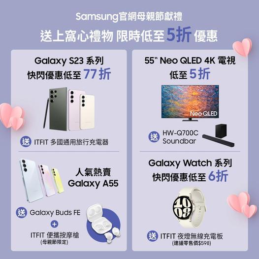 Samsung官方網站推出限時母親節優惠,手機及家電產品均有減價或贈送禮品。