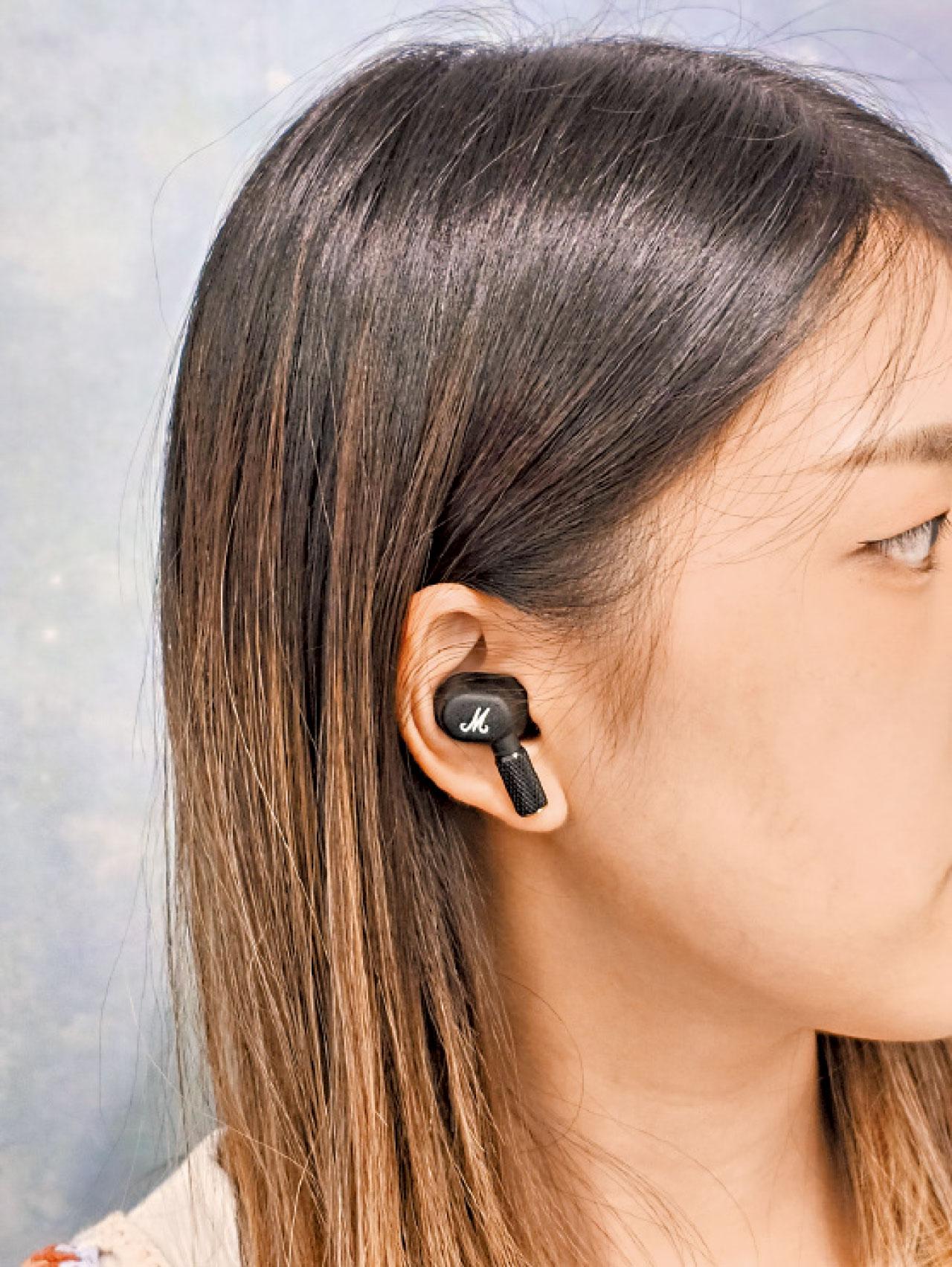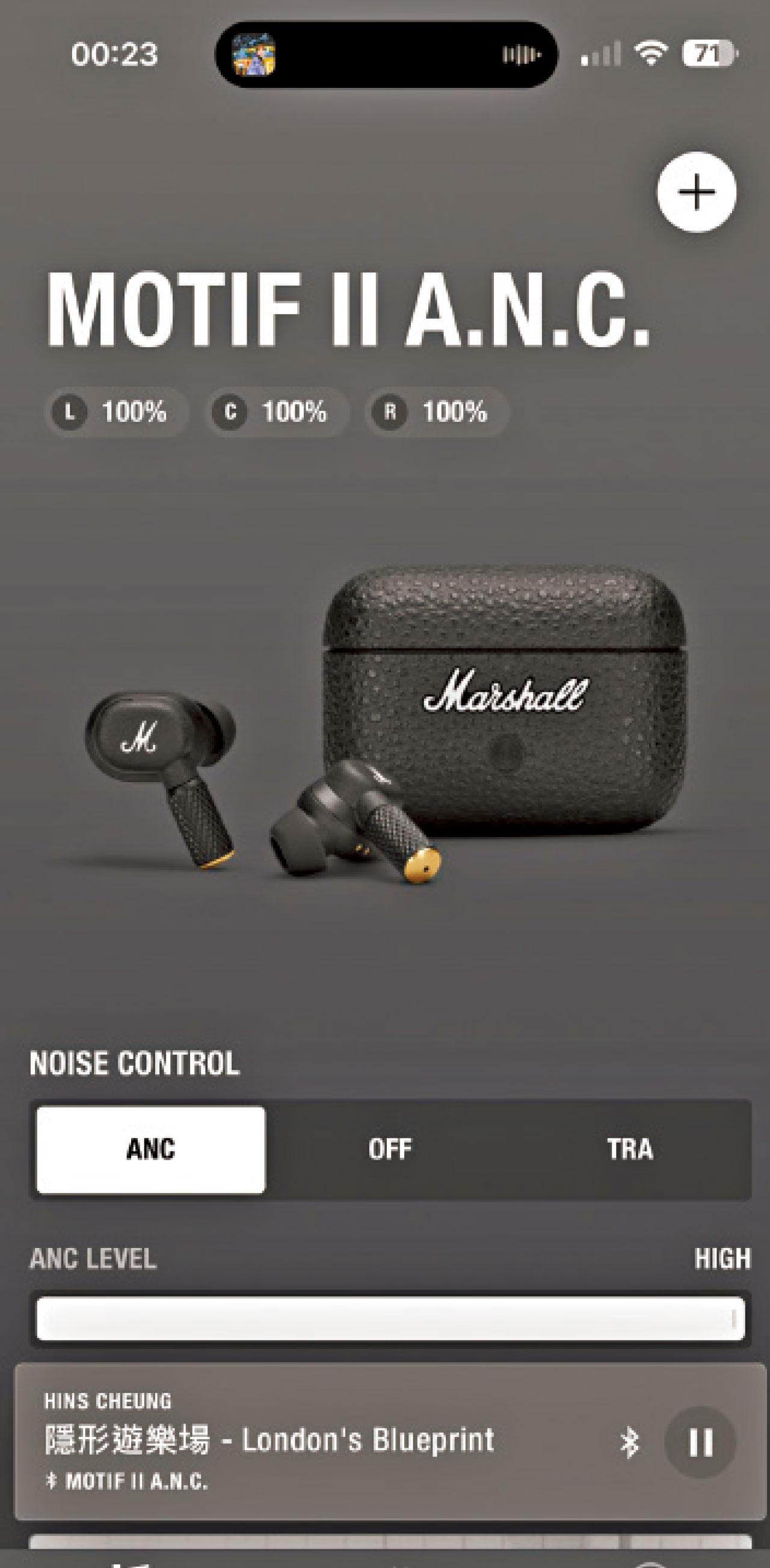 驟眼看新一代Motif II A.N.C.的外觀跟初代變化不大。如新作的充電盒印有Marshall標誌,亦提供電池顯示燈;每邊耳機照舊採用短柄設計,但新作的柄端多了層金色包覆。然而Motif II A.N.C.改良了主動降噪功能,關鍵在於耳機上方大面積收音咪,通過雙麥克風波束成形和人工智能的噪音消除技術,大幅改善環境噪音效果。如果接駁《Marshall Bluetooth》app,更是驚喜連連!事關新操作介面更好用,如3種降噪模式可個別調校強度,按鍵更醒目;另外今代終於可自訂EQ,提供5個頻段供用家自由改變高低頻,帶來更個人化的沉浸式聆聽體驗,這些都是初代所無法提供的功能,實在貼心。