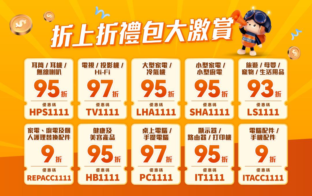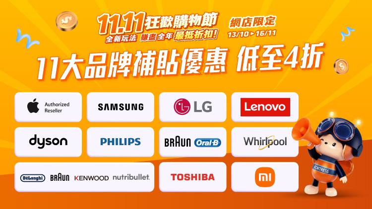 豐澤網店特別聯合11大人氣品牌,推出狂歡購物節限定的補貼優惠,指定品牌產品折扣更低至4折。熱門品牌包括APPLE、SAMSUNG、LG及DYSON等。