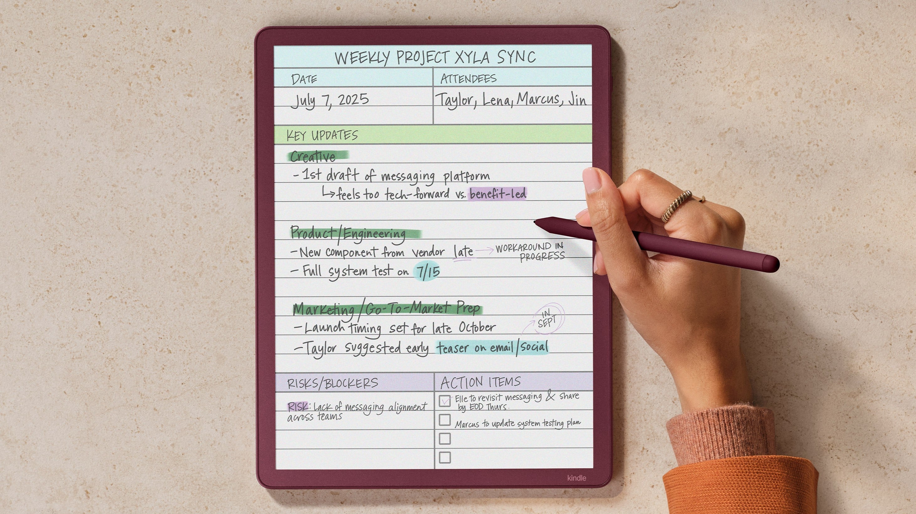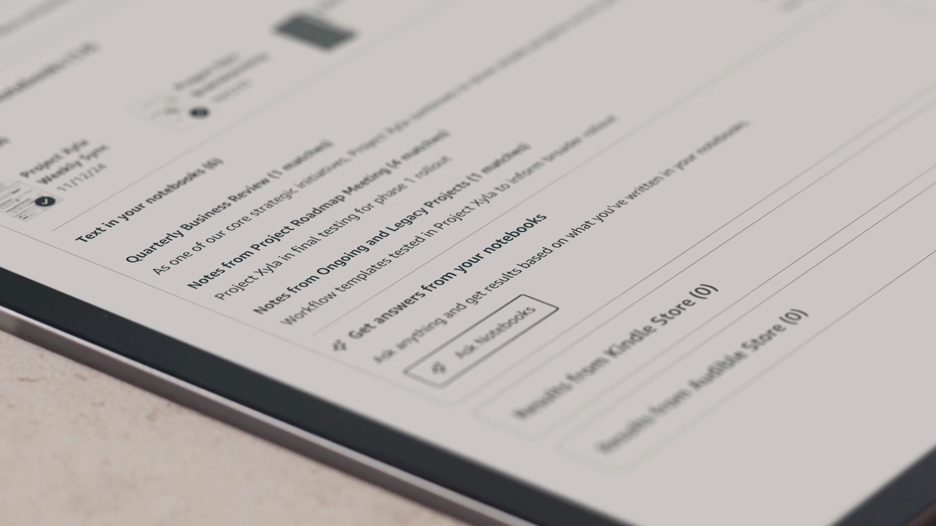 Amazon Kindle Scribe如簡單的筆記型電腦,內建AI驅動工具的筆記本,有人工智能搜尋、總結、修飾文字、轉換文字格式等功能。只需寫在書本或Microsoft Word文件中開始書寫,Active Canvas會自動調整文字位置,同時亦可在頁邊空白處做筆記。文件亦可直接從Google雲端硬碟和Microsoft OneDrive匯入到裝置上進行標記,並匯出到Microsoft OneNote。