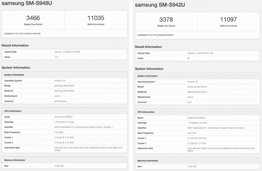 從最新流出的資料顯示,代號 SM-S948B 的頂級旗艦 Galaxy S26 Ultra 搭載了代號為「Sun」的最新一代 Snapdragon 8 Gen 5 處理器。其跑分表現相當強勁,單核得分穩定落在 3,400 分左右,多核得分更一舉超越 10,000 分大關,顯示新一代晶片在架構優化後,運算速度與多工處理能力已達到行動裝置的新高點。此外,該機配備了 12GB RAM 並運行最新的 Android 16 系統,顯示其軟硬體調優已趨於成熟。