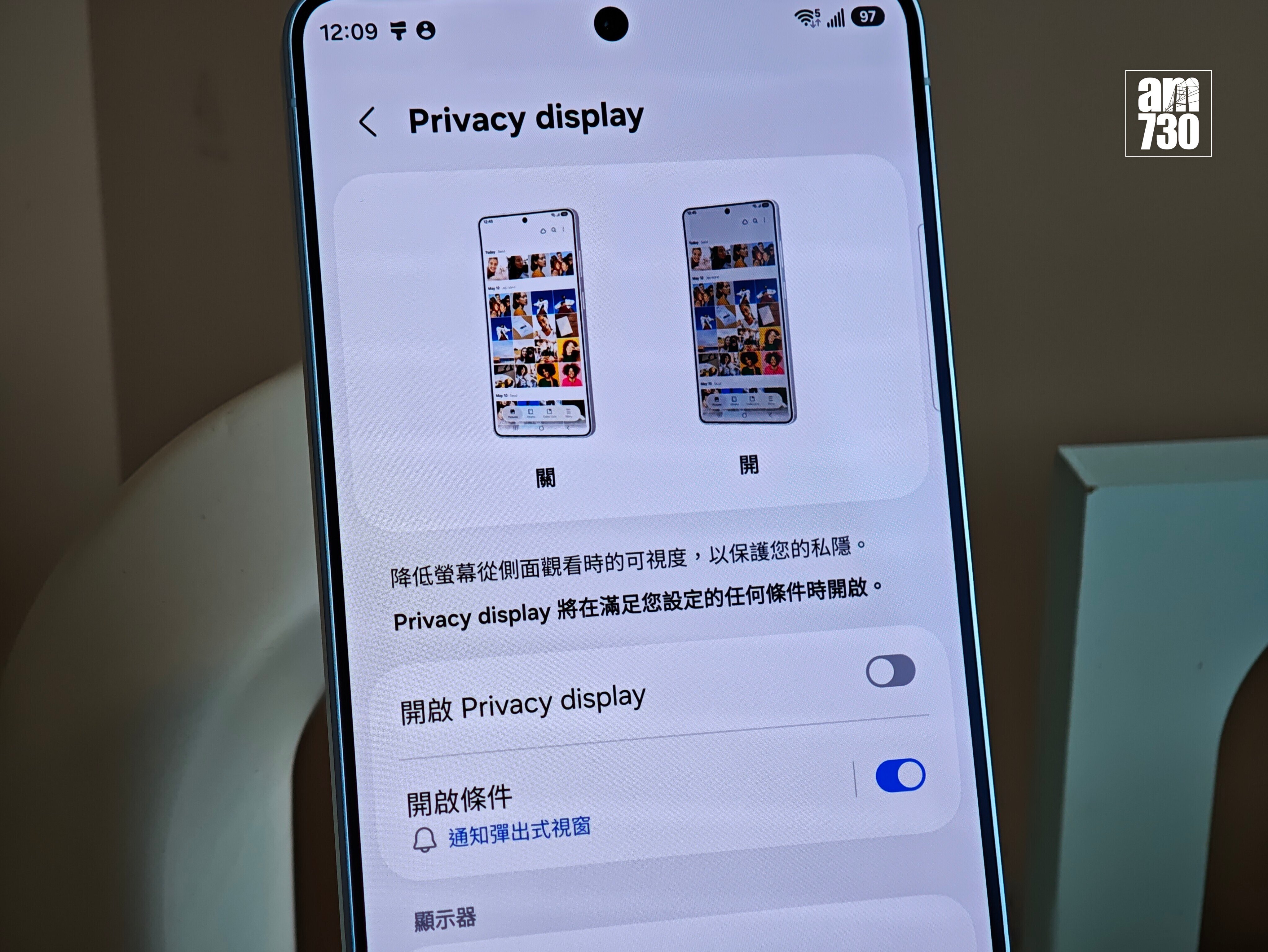 最矚目可說是只限Galaxy S26 Ultra的首創硬件私隱屏幕Privacy Display,啟用Privacy mode時,屏幕會使用相對較窄的像素以縮窄視線角度,讓旁人難以從側面窺視,限制看到的內容,正面觀看依然清楚,完全不受影響,實試過真的好用。最聰明的是系統亦按個人需要設定啟用條件,例如在開啟指定應用程式或收到通知時自動觸發,不需每次開關,以後不須使用防窺芒貼。