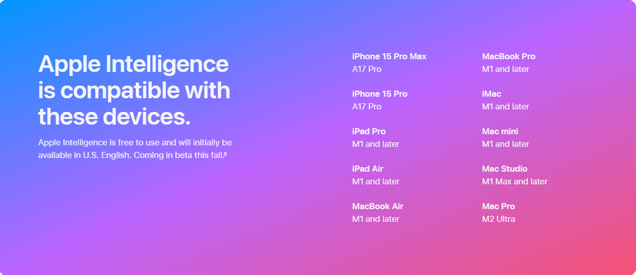 Apple Intelligence於今年秋天以測試版(Beta)登場,而且僅限美式英文才能使用,所以香港屆時有冇份仍是未知之數。最重要是哪部機可以用到?iPhone方面只限使用A17 Pro晶片的iPhone 15 Pro及iPhone 15 Pro Max;iPad、MacBook及iMac只限M1晶片以上,如剛入手iPhone 15一定想哭。以下為可用Apple Intelligence裝置列表: