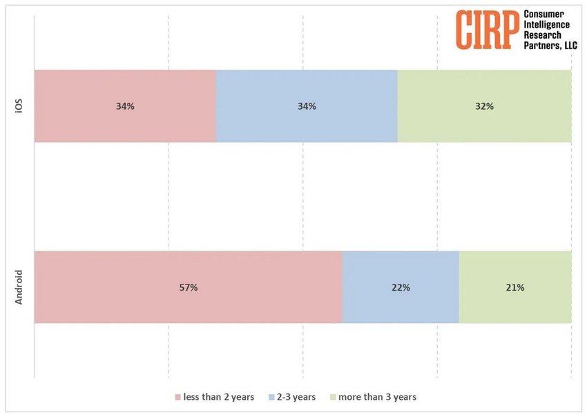 根據美國消費者研究組織 Consumer Intelligence Research Partners (CIRP) 的一項最新調查,57% 的 Android 用戶表示他們在不到兩年內就更換了上一部手機。相比之下,只有 34% 的 iPhone 用戶在兩年內更換手機。這意味著 Android 用戶更傾向於較短週期內升級設備。