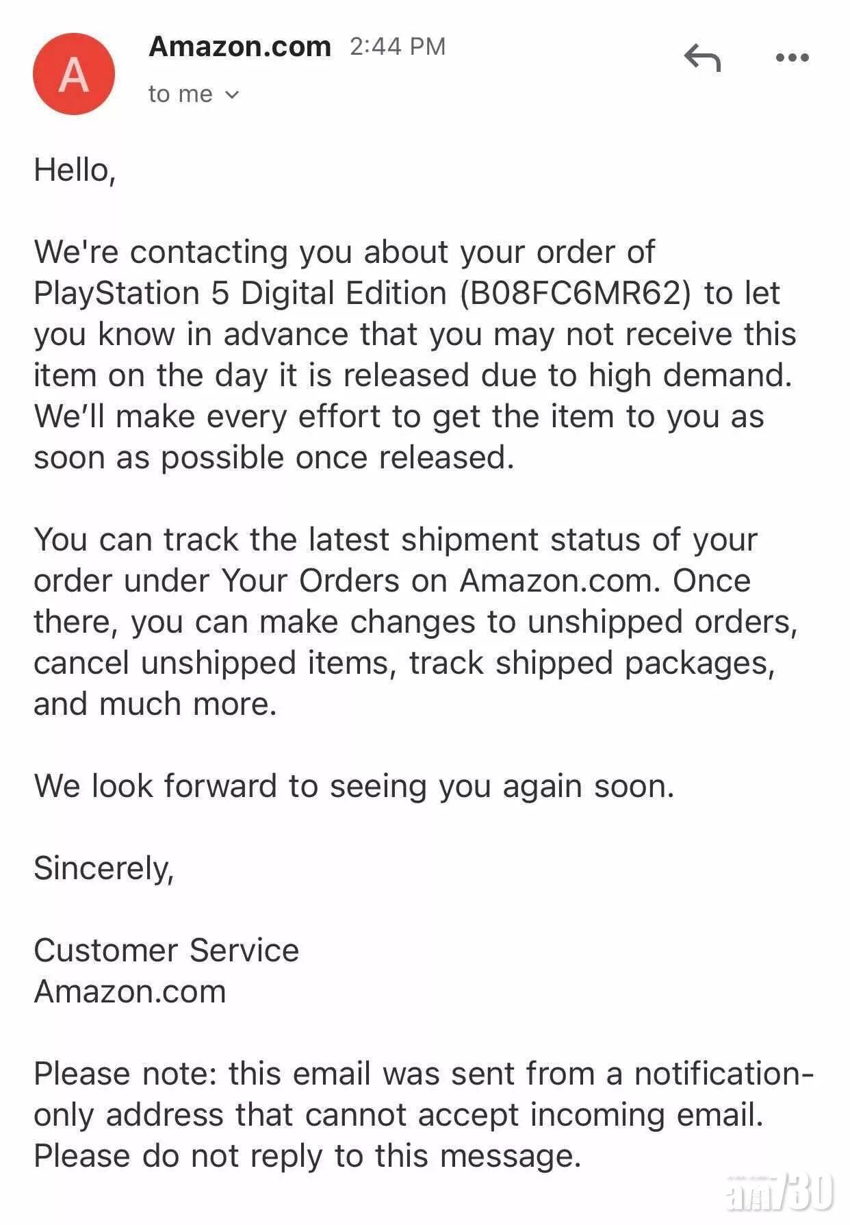 與此同時Amazon亦向顧客發出通知,提醒訂購了PS5的顧客未必能在發售首日取得主機,因為店主仍未知到當日會有多少台主機到貨。