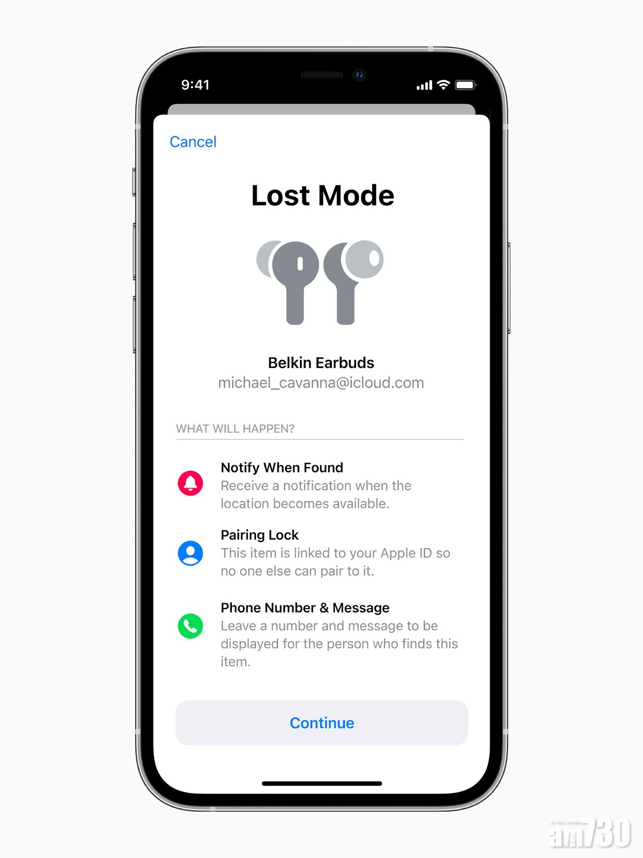 用戶可在遺失模式建立一段訊息和聯絡電話與拾獲者聯繫,並在《Find My》app網絡找到它的位置時收到通知。