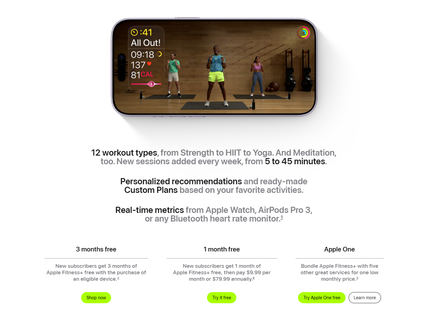 Apple Fitness+提供訂閱服務,價格為每月$58或每年$468,可與多達5位家庭成員共享。凡於Apple或Apple授權經銷商購買全新Apple Watch、iPhone、iPad、可運行最新操作系統軟件的Apple TV、AirPods Pro 3或Powerbeats Pro 2,即享免費試用Apple Fitness+三個月。