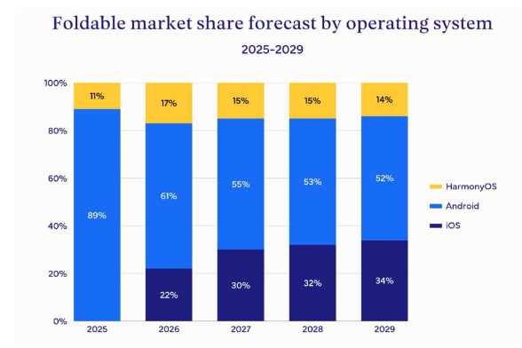 根據IDC基於作業系統的摺疊手機市場份額預測圖表(2025–2029 年),HarmonyOS 的市佔率將從 2025 年的 11% 上升至 2026 年的 17%。不過,隨着蘋果在後續幾年加入戰局,HarmonyOS 的份額可能逐步受到擠壓。