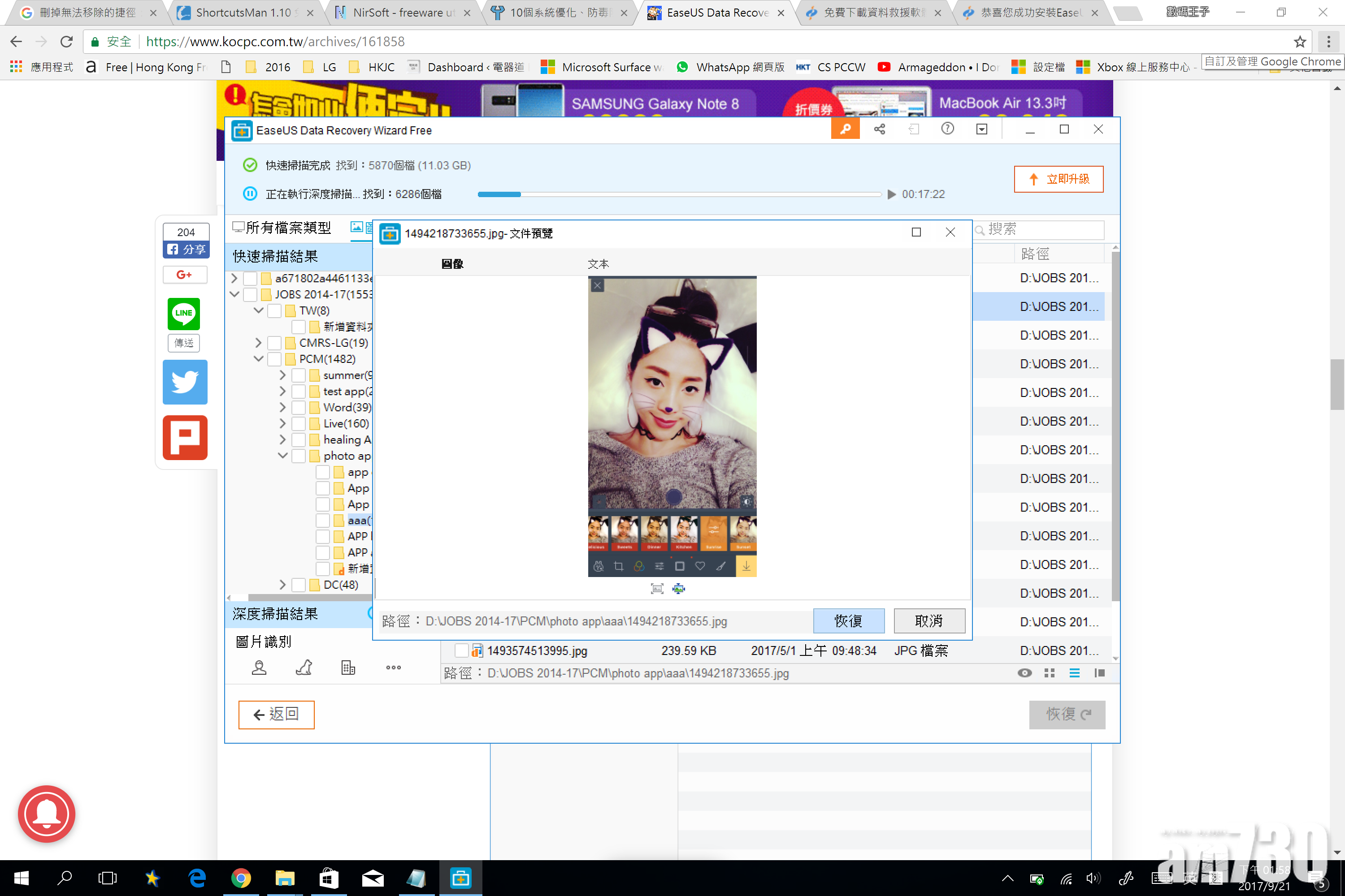 很多用戶也試過在電腦、記憶卡或USB內誤刪檔案、文件和照片,免費軟件EaseUS Data Recovery Wizard可以回復被刪除和格式化,甚至遭病毒感染而損毀的檔案,使用方法也很簡單,只要幾個步驟即可完成。