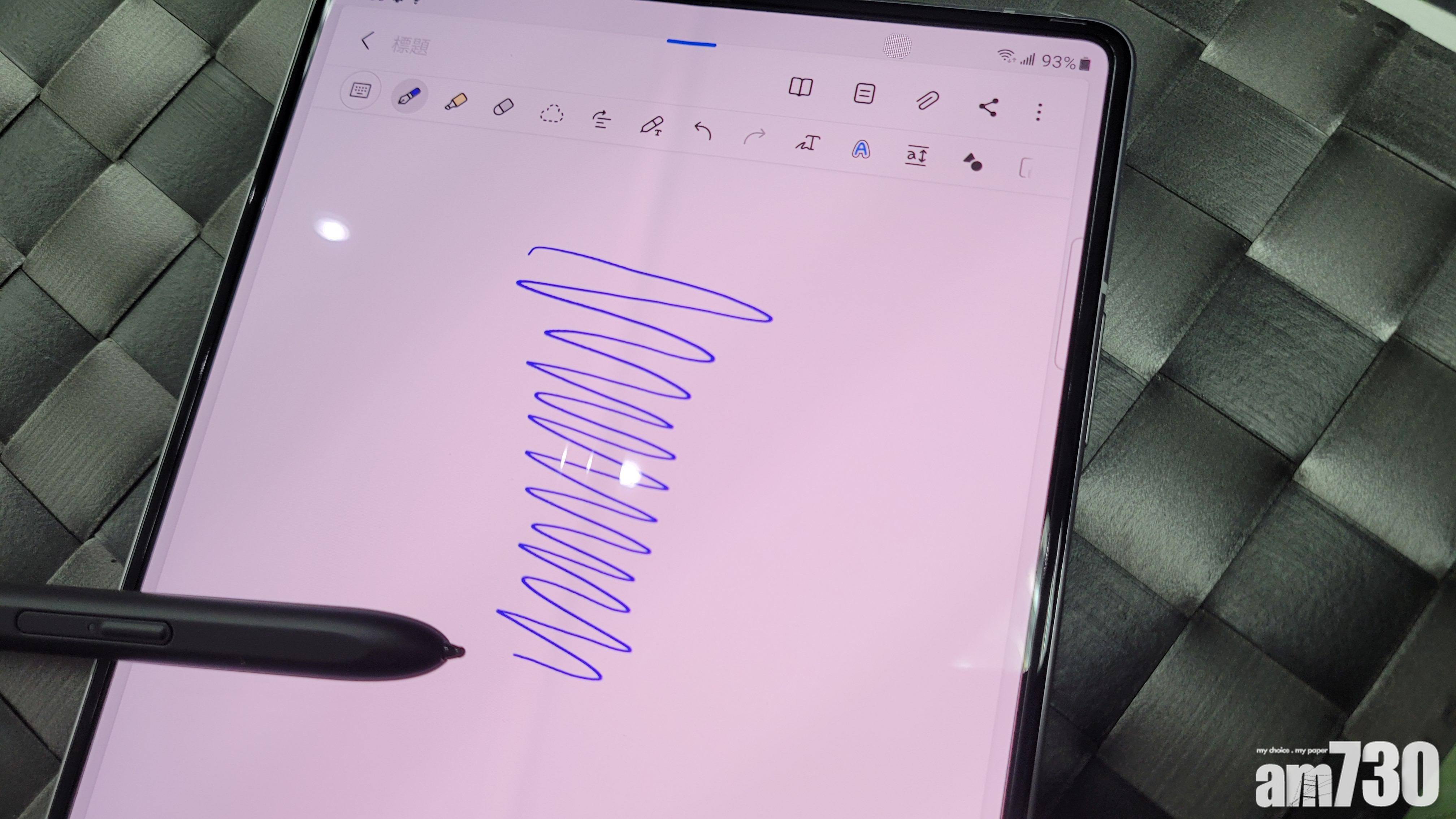 Fold3所用的是一塊7.6吋柔面屏,要支援開合摺疊,需要塑膠面板來維持強固度,但今代為了支援S Pen書寫,太膠的面板或會令觸感變厚。因此今代的面板製程進化至多層屏幕技術,由最底層的Wacom板,依次OLED、Ultra Thin Glass玻璃面板、防護用塑膠聚合物,而最表面的是已預先貼上,具彈性的PET保護貼。以S Pen實際使用時,仍有一點點像在膠膜表面書寫,但「膠感厚度」已較上代大幅減少,不會影響筆觸靈敏度,值得一讚。另外快速書寫時,筆觸經過摺痕時,雖有凹陷感,仍不太改變線條;惟大力慢動作畫線,才會有一點筆觸落差。值得一提,Fold3與Flip3隨機已預貼PET保護貼,不要自行撕走,否則將會無法好好保護屏幕。