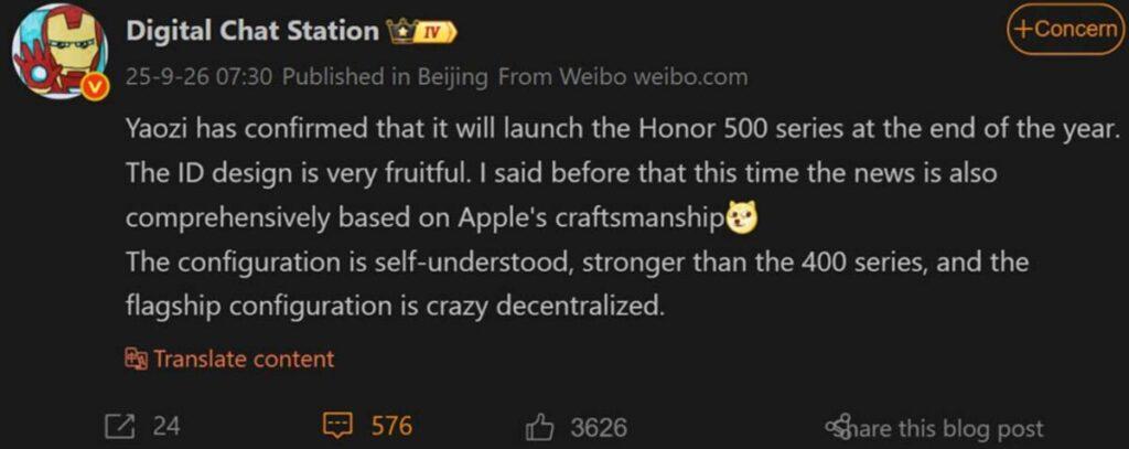 據知名微博爆料人@DigitalChatStation指出,HONOR已確認會在年底前推出500系列,並強調其擁有「美麗的設計」。