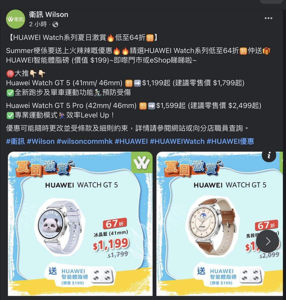 是次HUAWEI WATCH GT5優惠由衛訊香港官方網店提供,據衛訊香港Facebook專頁資訊,多款產品以低至64折、最平$1,199價格開賣。