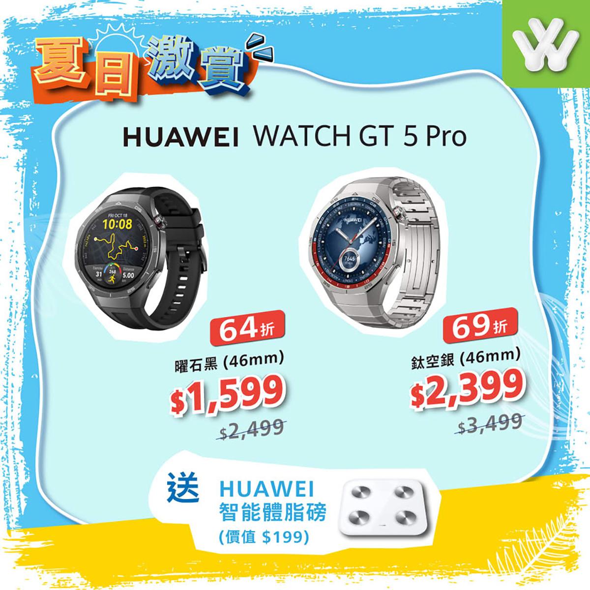 優惠力道最強的46mm曜石黑色款HUAWEI WATCH GT 5 Pro智能手錶,優惠價$1,599(原價$2,499)享64折,同樣送$199智能體脂磅。