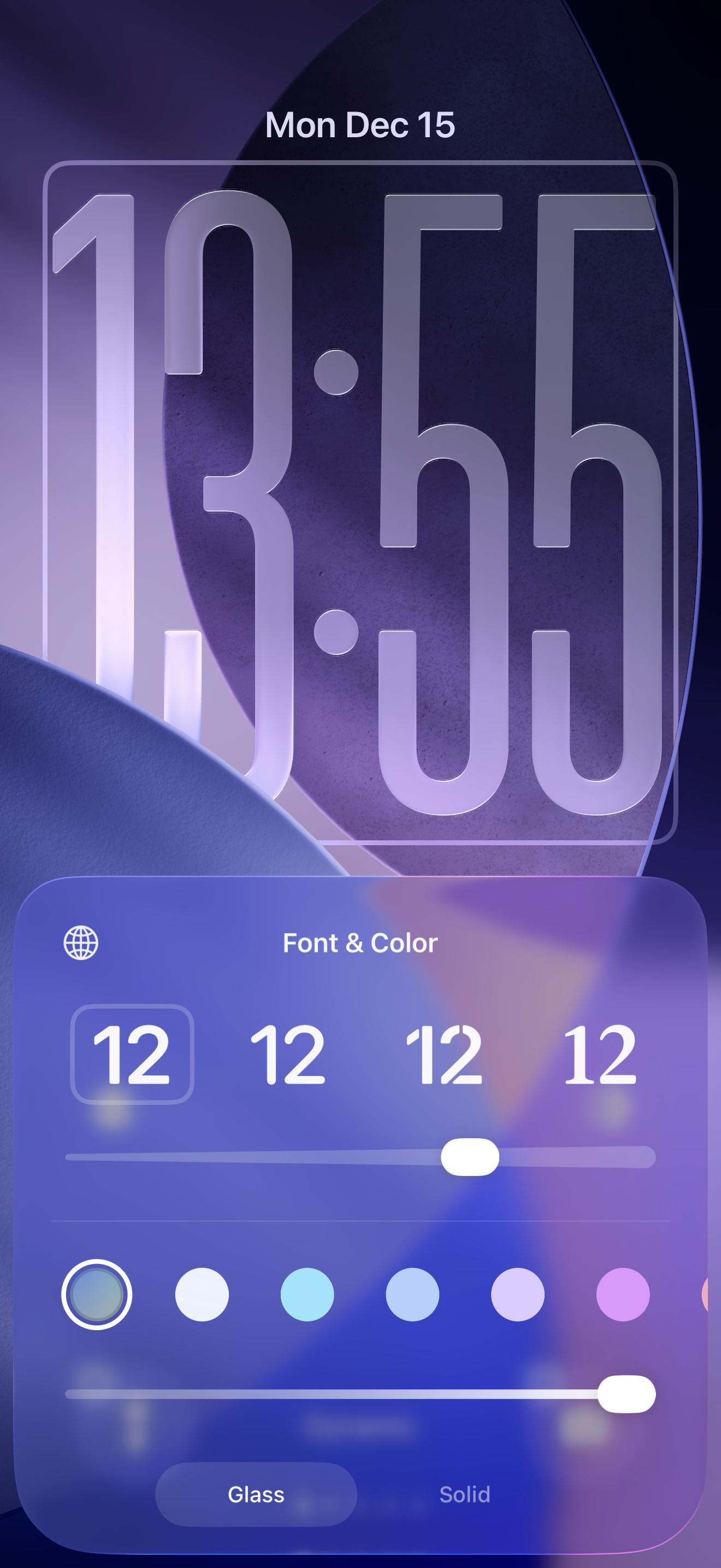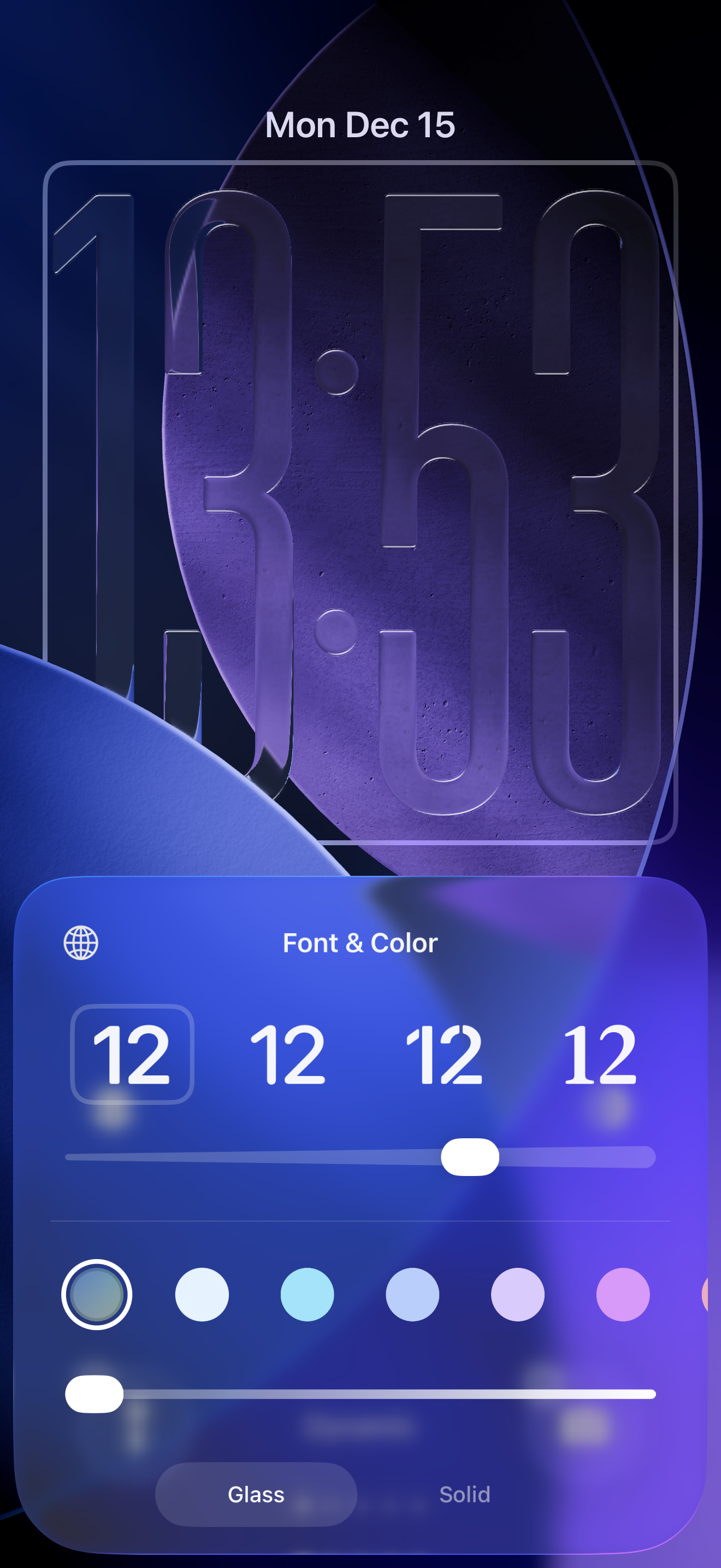 鎖定畫面介面新增了「液態玻璃」滑桿,可讓自訂時間顯示效果。使用「玻璃」選項時,用戶可以透過滑桿將時間顯示器調整為幾乎完全透明,或使其呈現磨砂質感。如果想要更不透明的設計,還有一個單獨的「固體」開關,可以完全關閉時鐘的液態玻璃外觀,也可以繼續使用時間的顏色選項。