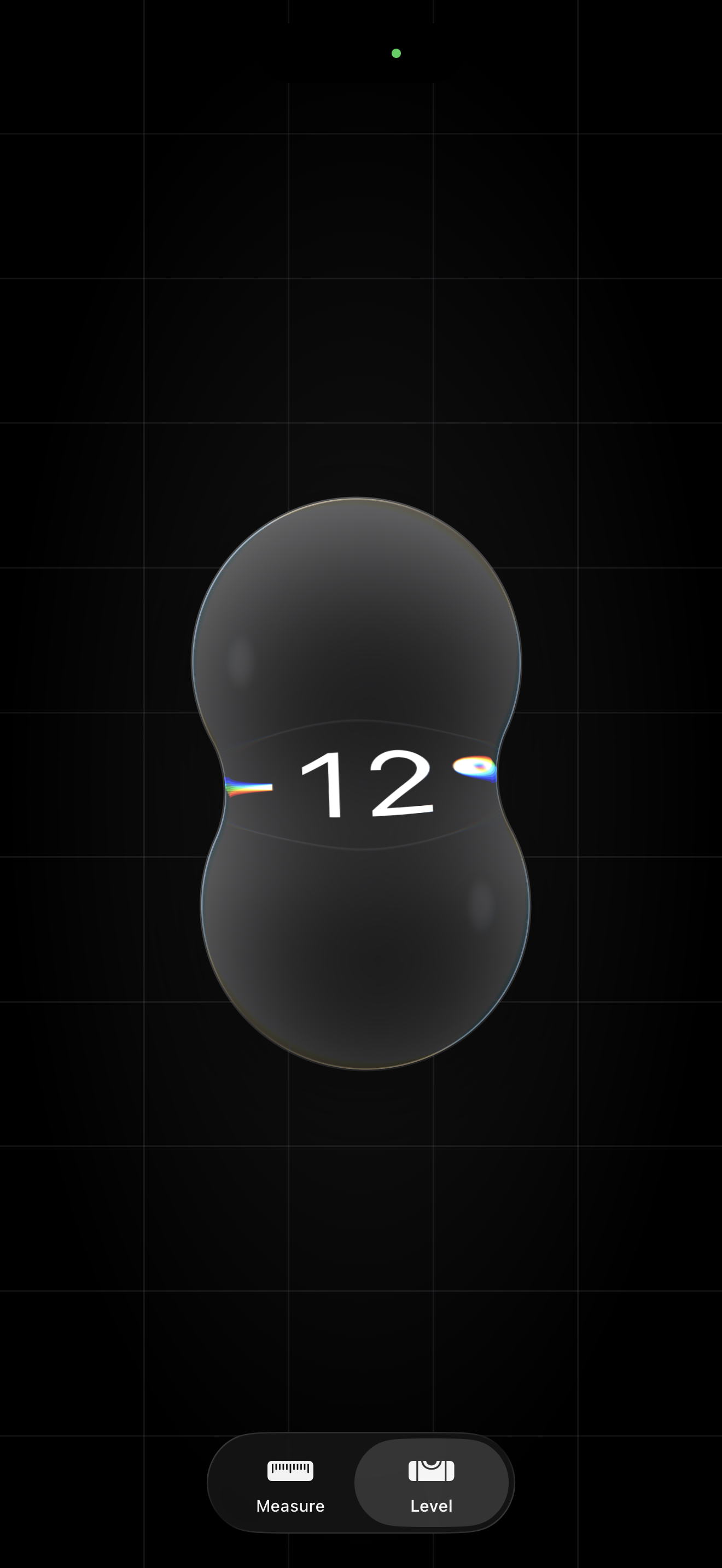 iPhone的量度水平儀應用現在採用了液態玻璃風格的標尺設計,用兩個液態玻璃氣泡取代了白色圓圈。