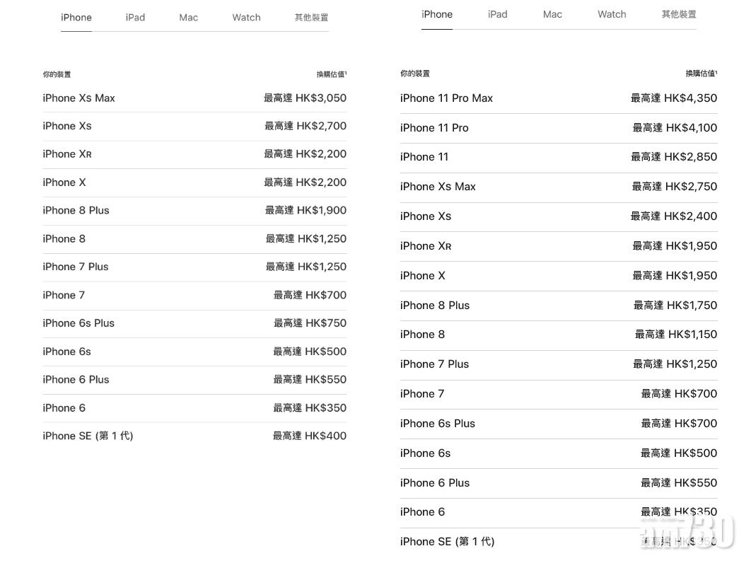 早前已經有消息預言iPhone 12發表後,舊型號iPhone的官方回收價將會大幅下跌。今日再看看Apple官方最新資料,發現Apple Trade In換購計劃裡舊iPhone的回收價已經下跌了一成有多,反觀網上報價雖然仍有所下跌,不過跌幅就沒那麼利害。